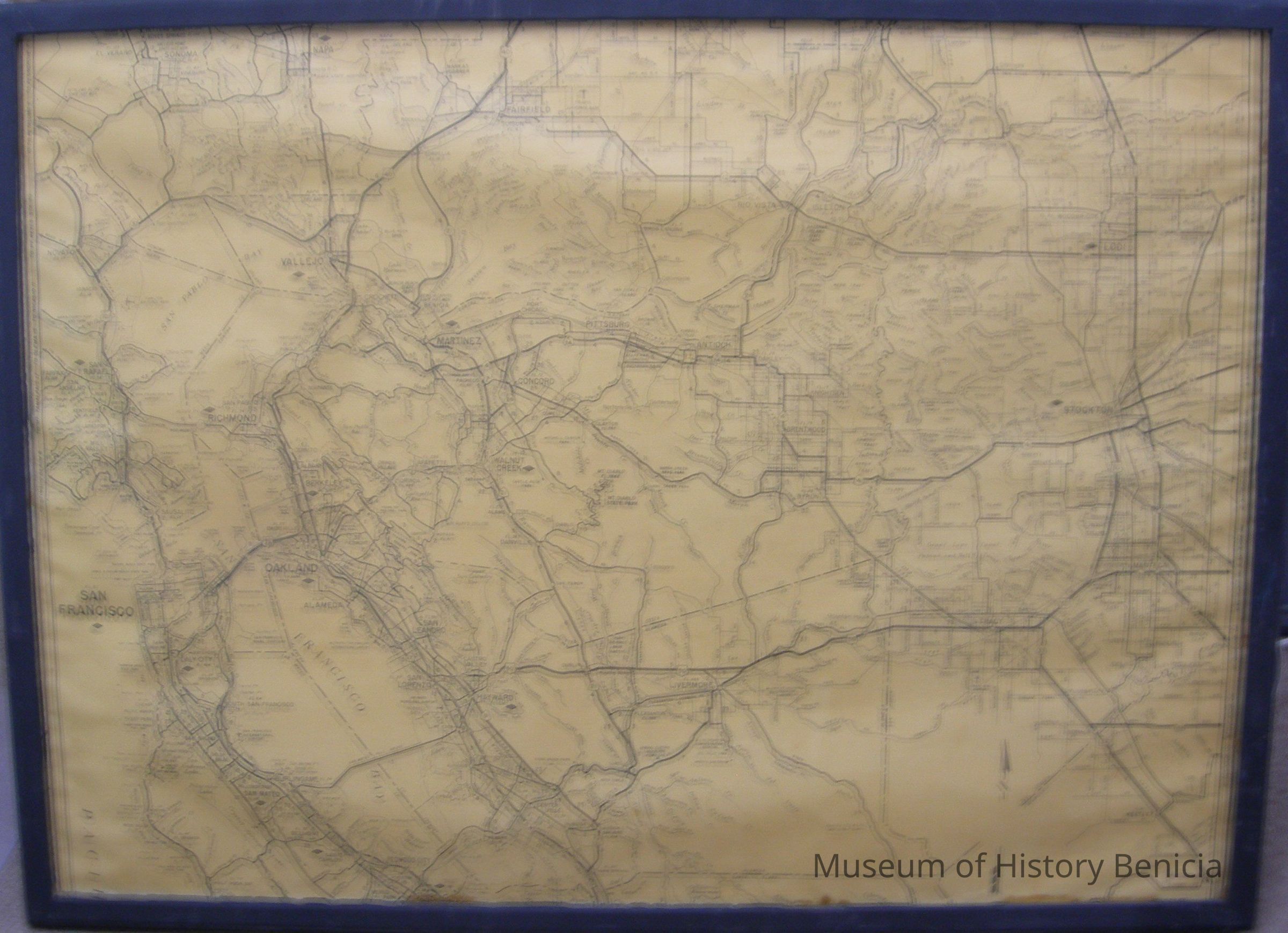 The map can be dated by the fact the name of the Fairfield-Suisun Army Air Base was renamed Travis Air Force Base in 1951 and that is the name shown on the map. Also it was drawn before 1960 because there is no indication of a Benicia Martinez Bridge or even a "proposed" bridge - "Ferry" and a dotted line connect Benicia and Martinez.