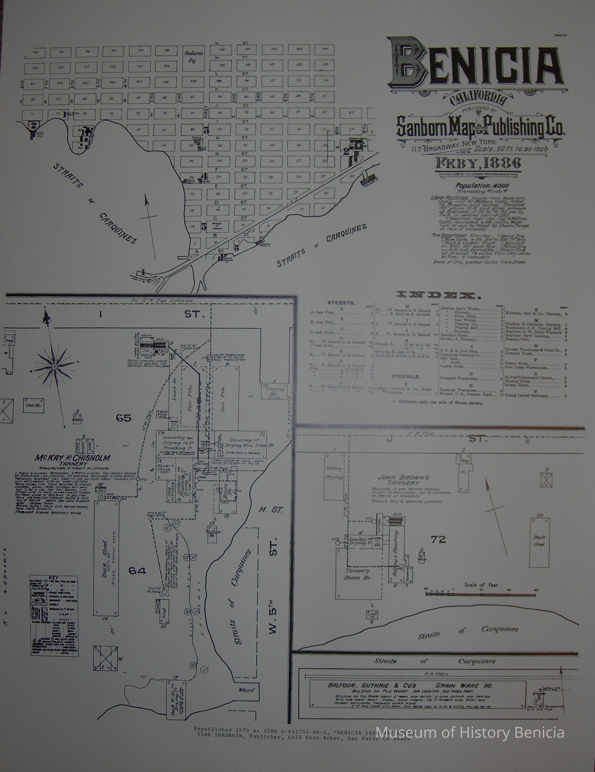 Includes street map of Benicia below N Street from West 8th to East 7th Streets, an index, insets: McKay & Chisholm Tannery; John Brown's Tannery; and Balfour, Guthrie & Co. Grain Ware House