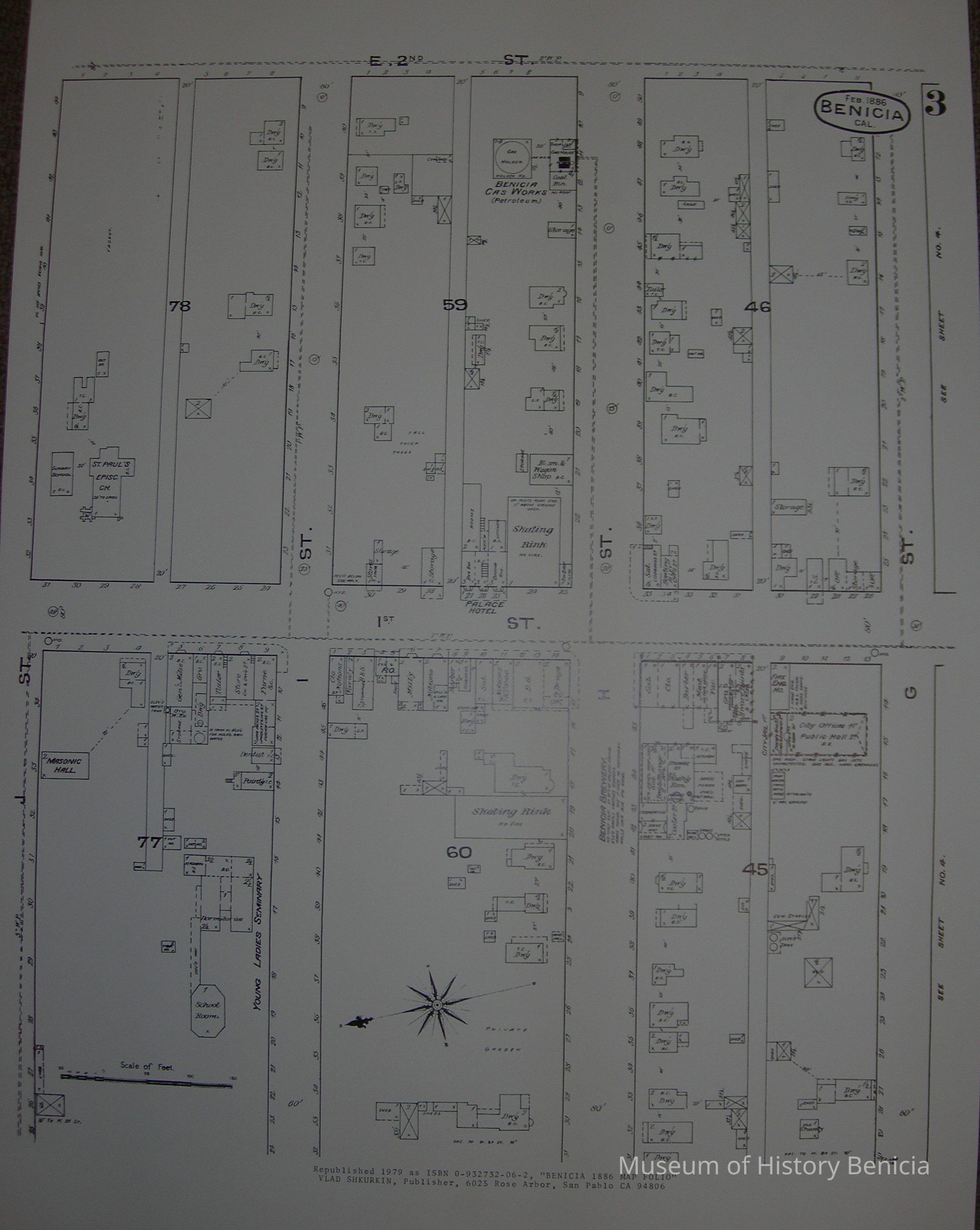 Sheet Three of Benicia Map Folio - Sanborn Map & Publishing Co. Limited, February 1886, republished in 1979 by Vlad Shkurkin, publisher.