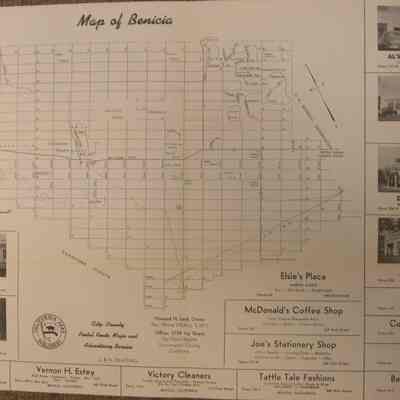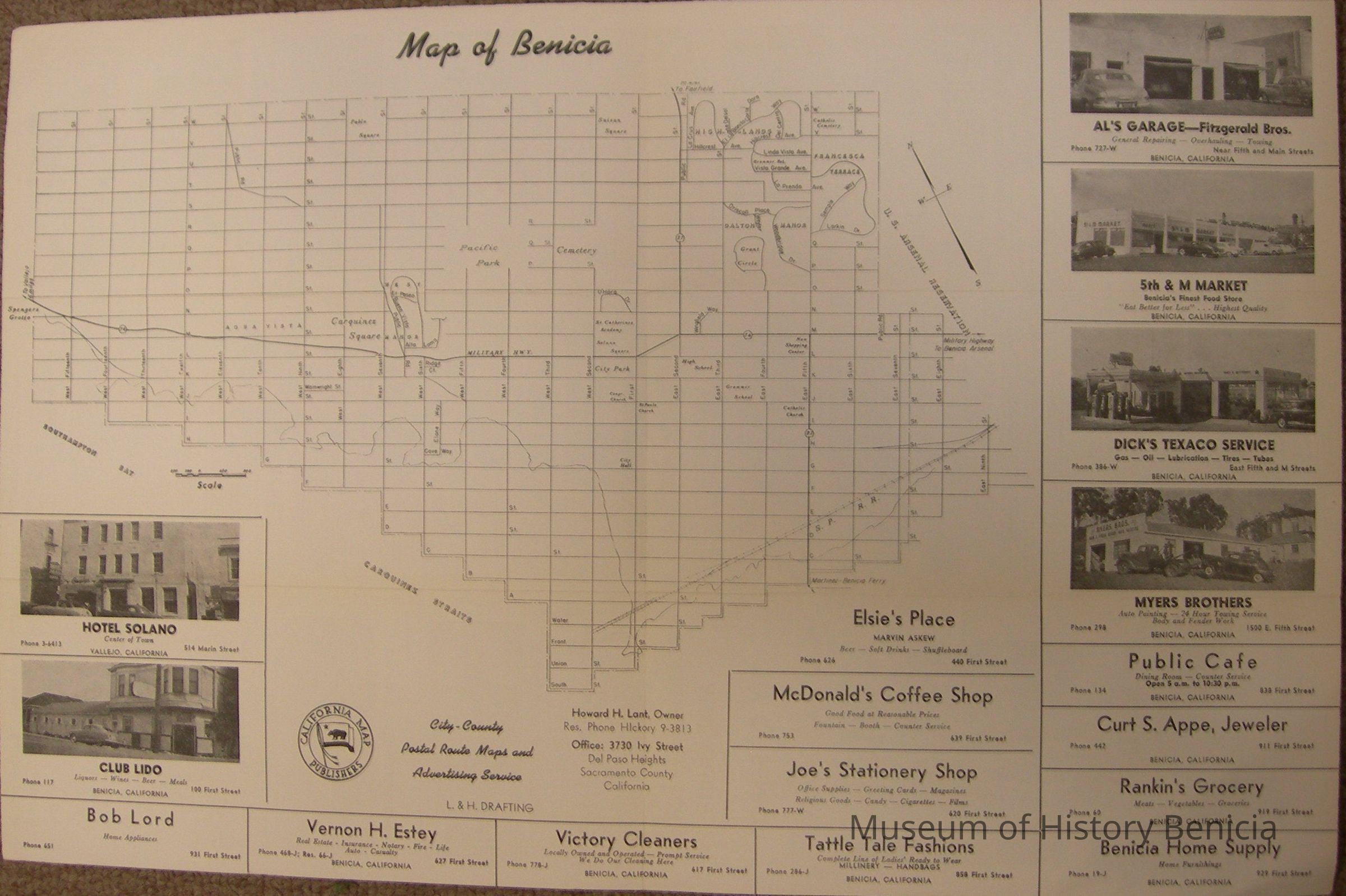 Side One: map of the city, six photographs of businesses - Al's Garage/Fitzgerald Bros., 5th & M Market, Dick's Texaco Service, Myers Brothers Auto Service, Hotel Solano, Club Lido, along with ten other small business ads