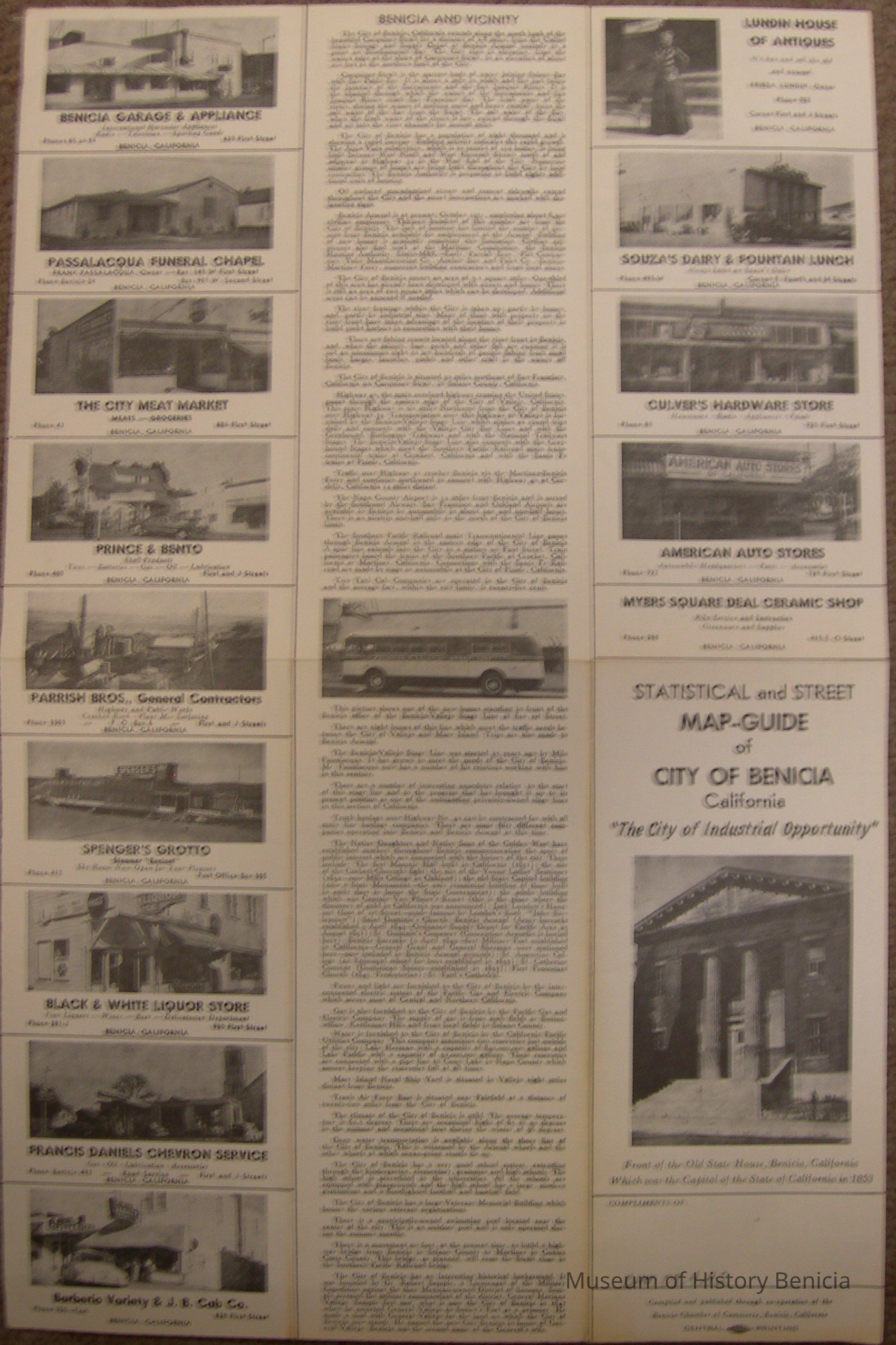 Side Two: information on the City of Benicia and surrounding area; thirteen photographs of businesses - Passalacqua Funeral Chapel, The City Meat Market, Prince & Bento Shell Station, Parrish Bros. Contractors, Spenger's Grotto, Black & White Liquor Store, Francis Daniels Chevron Station, Barberio Variety & J B Cab Co.
