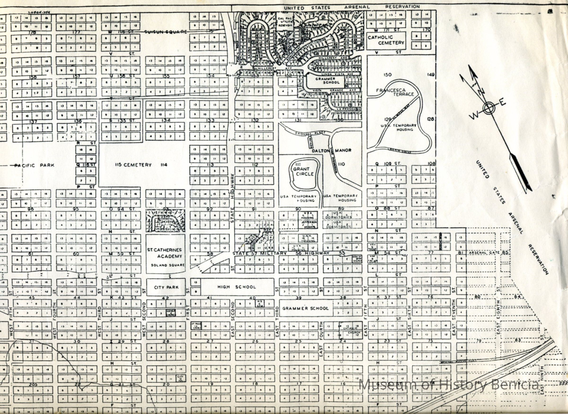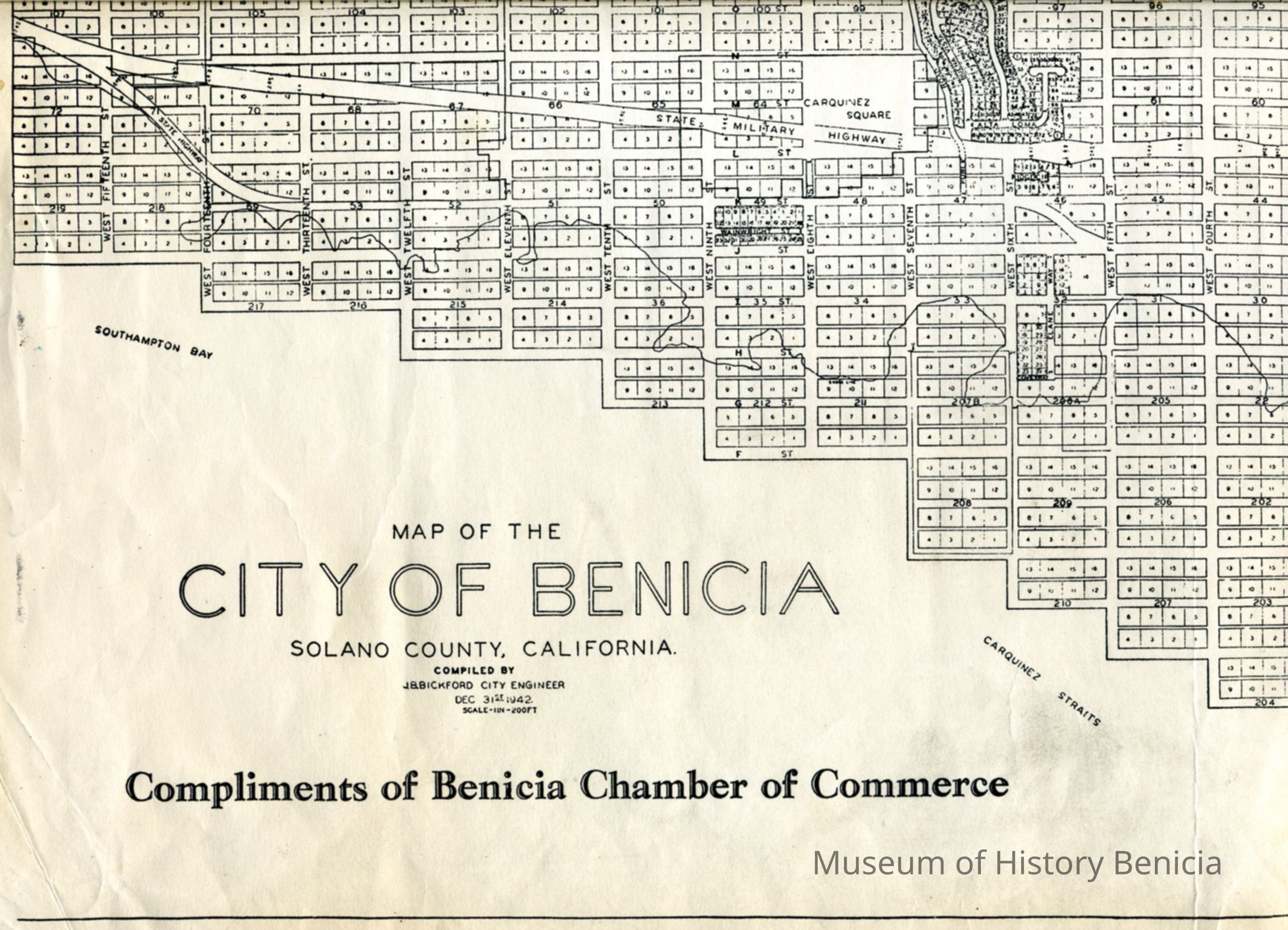 Survey map of the City of Benicia circa 1850 compiled by the City Engineer in 1942 and printed Compliments of Benicia Chamber of Commerce. Size - 13" x 22"