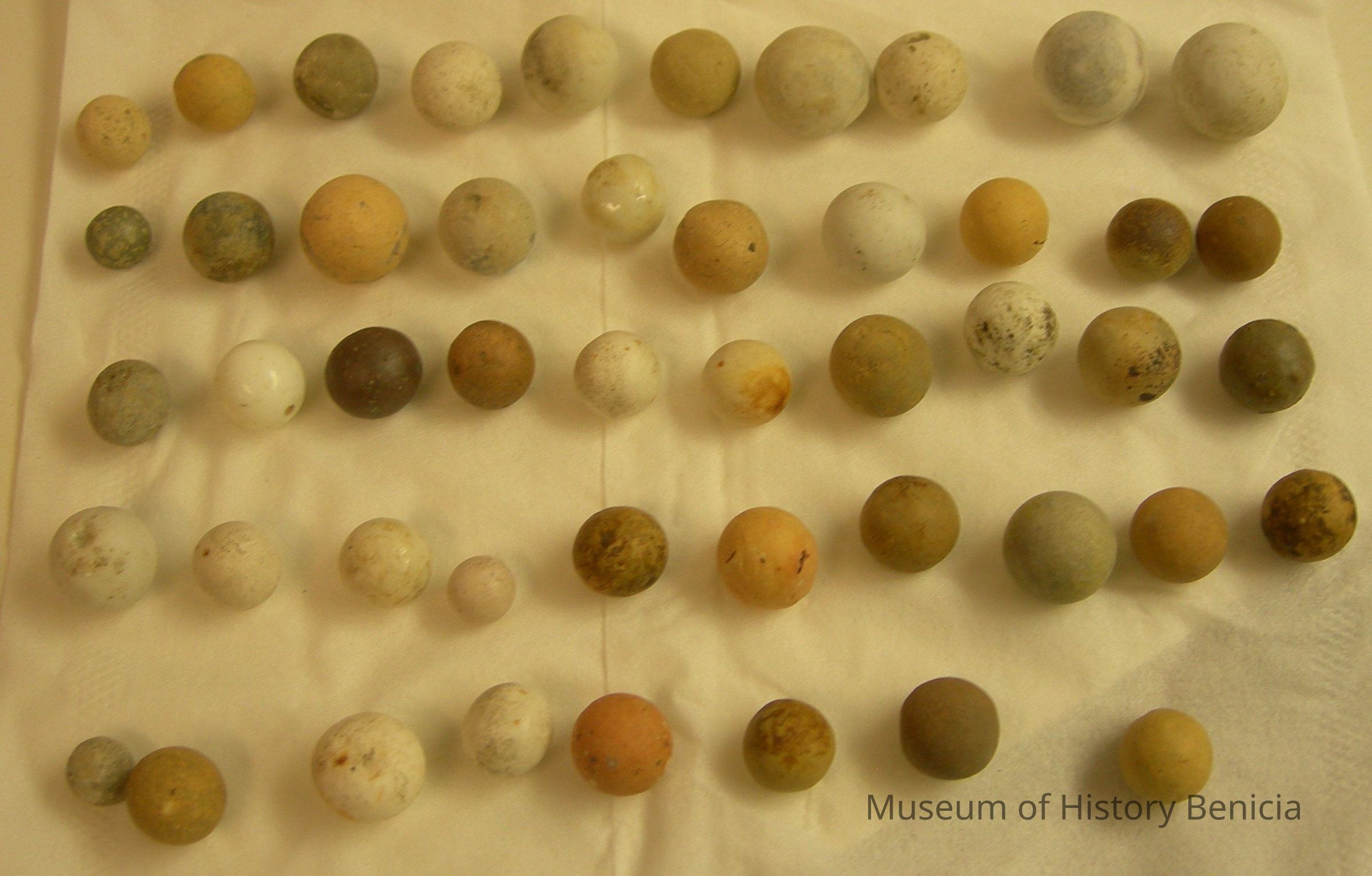 Bag of forty-eight marbles - old, pastel colors in brown, ochre, pink, white, gray; various sizes ranging from 3/8" to 3/4" in diameter.