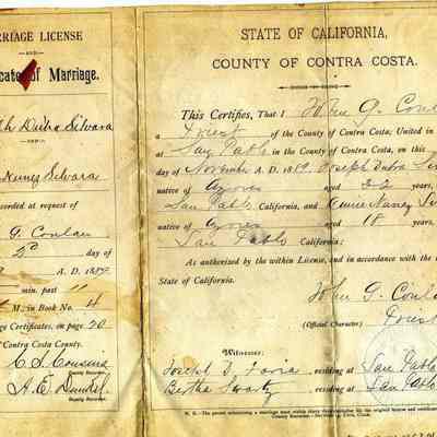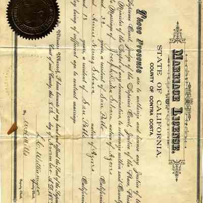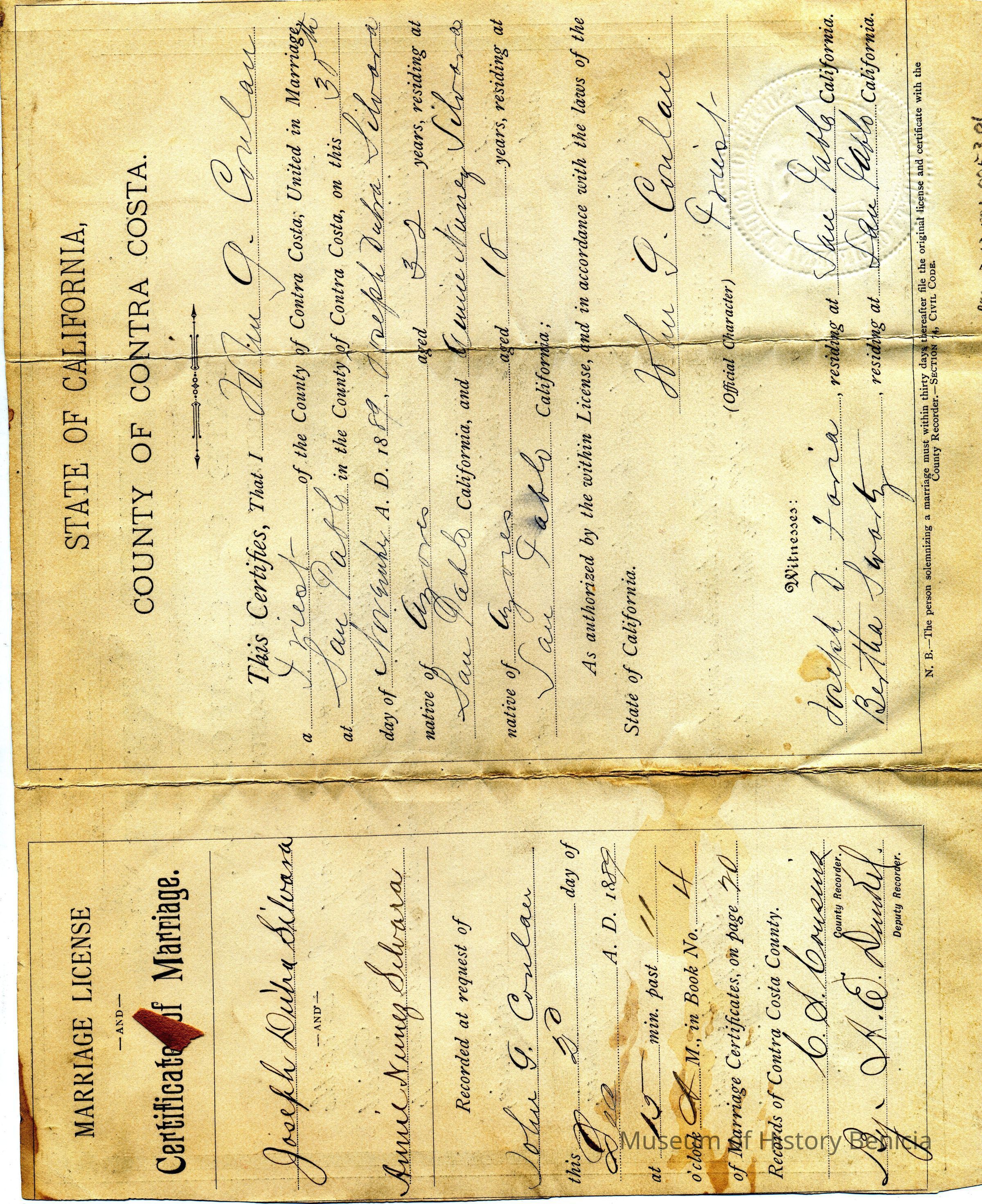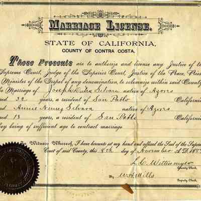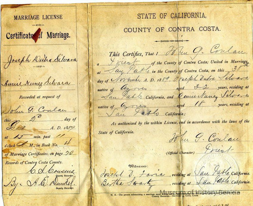 This is the original marriage certioficate that was in the scrapbook. It is for the marriage of Joseph Dutra Silvara age 32 and Annie Nunez Silvara age 18. Both are from the Azores and were married on the 2nd of Dec 1889. The license is dated 11/8/1889. Both resided in San Pablo California at the time of their marriage.Collection