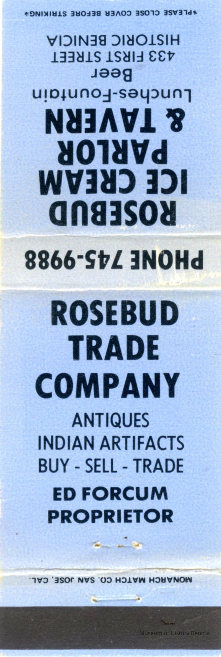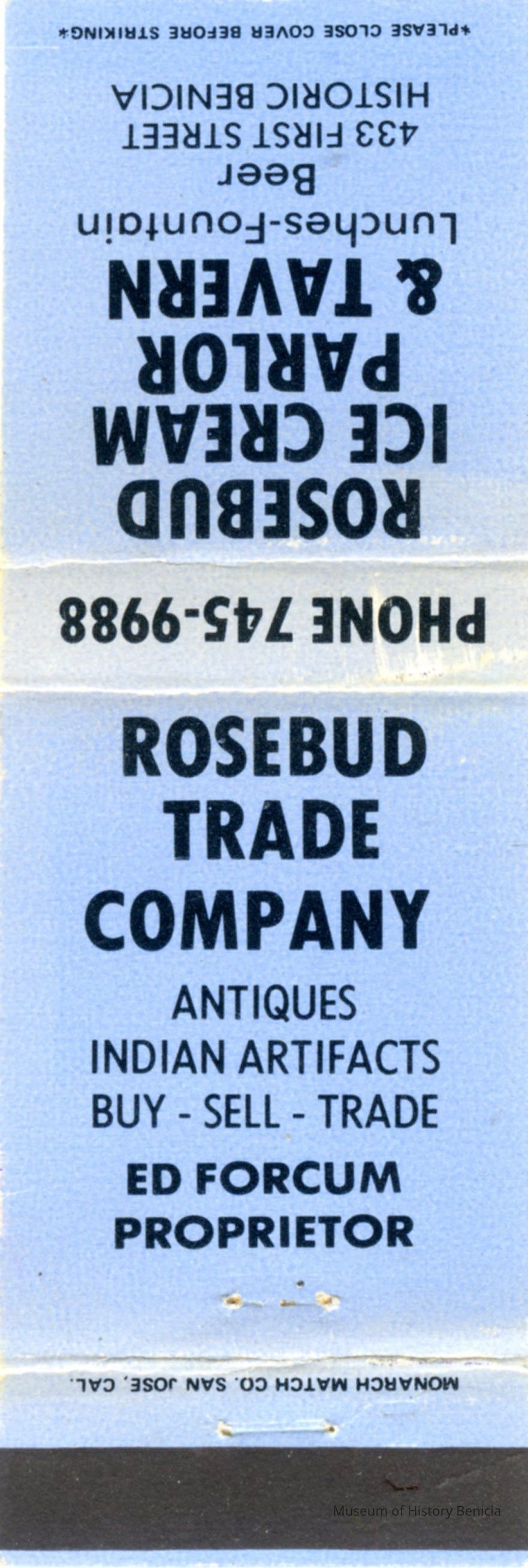 This is a matchbook from Rosebud Ice Cream Parlor and Tavern in Benicia. It was at 433 First Street in Benicia. (This is next door to Lucca's Bar and Grill.) Here are a couple of newspaper articles that mention Rosebuds:
