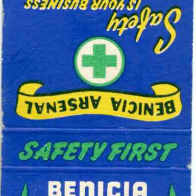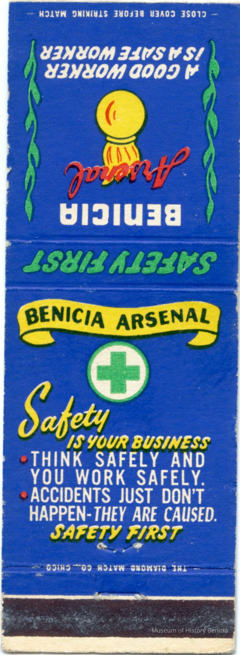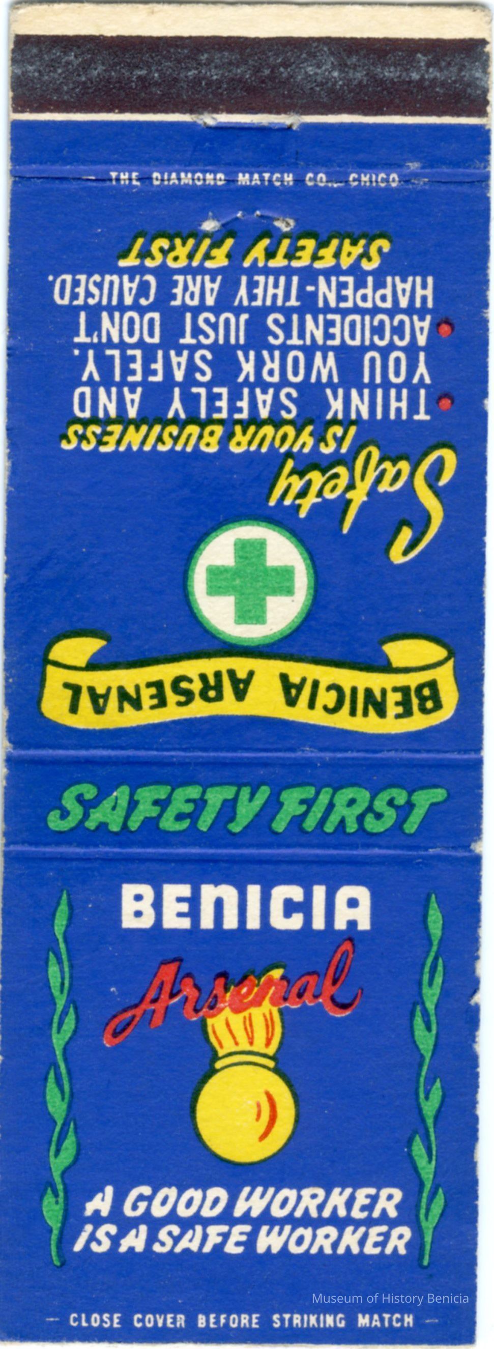 This is a matchbook from the Benicia Arsenal promoting Safety. It has the symbol of the ball and flame as well as several safety slogans: "A Good Worker is a Safe Worker"; Think Safely and You Work Safely"; "Accidents Just Don't Happen- They Are Caused".Collection
