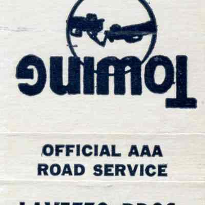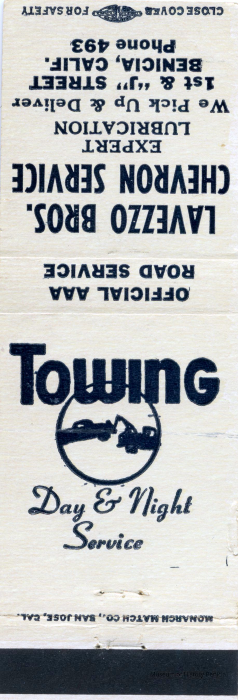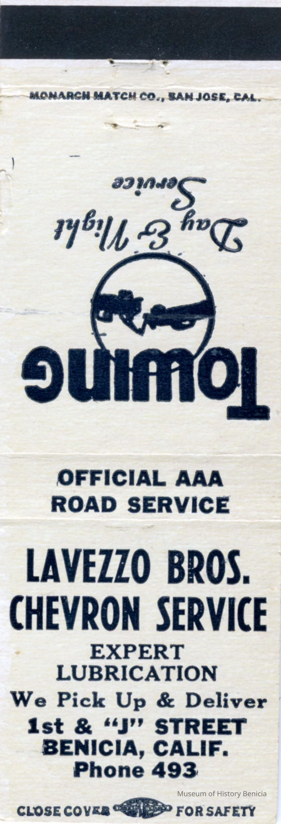 This is a matchbook from Lavezzo Brothers Chevron Service station at First an J street in Benicia. The Lavezzo brothers, Romeo, Tommy and Tony, bought the station in 1953. It was originally Francis Daniels Chevron in the 1940's.Collection