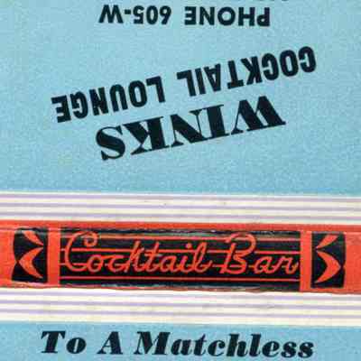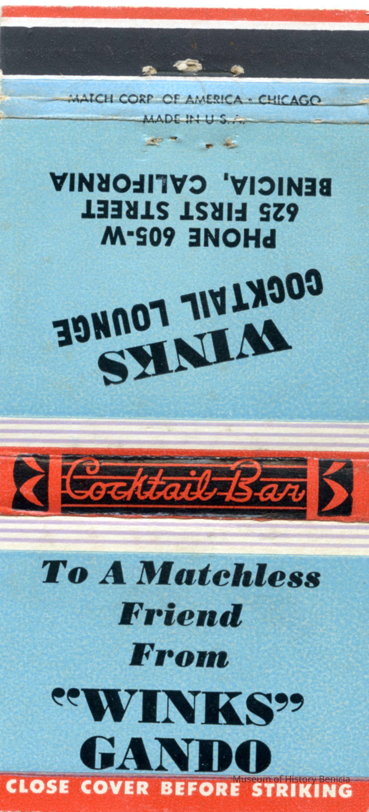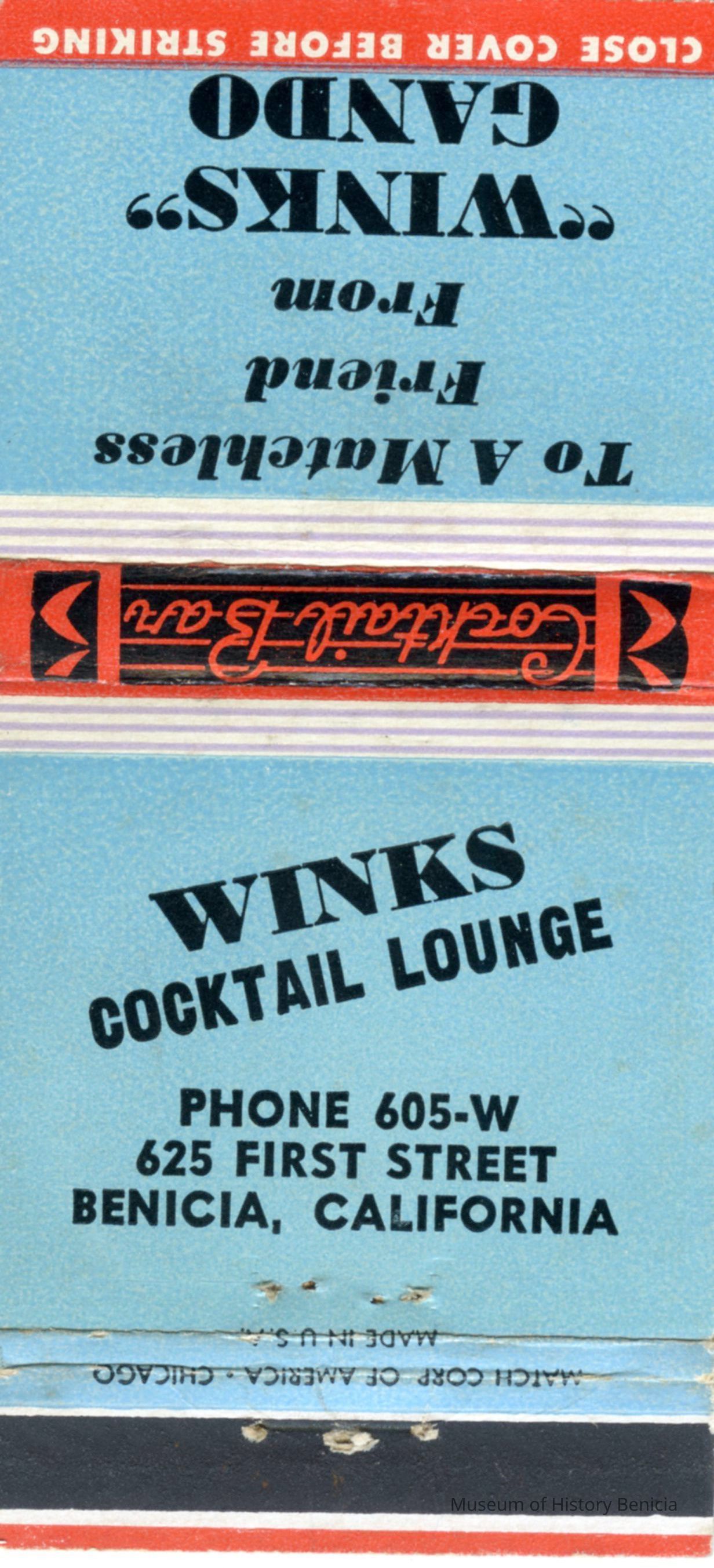 This is a matchbook from Wink's Cocktail Lounge in Benicia. It was owned by Joe "Winks" Gando. There is a sketch of him and short bio in the 1958 Old Timer's program (1998.017.0024).