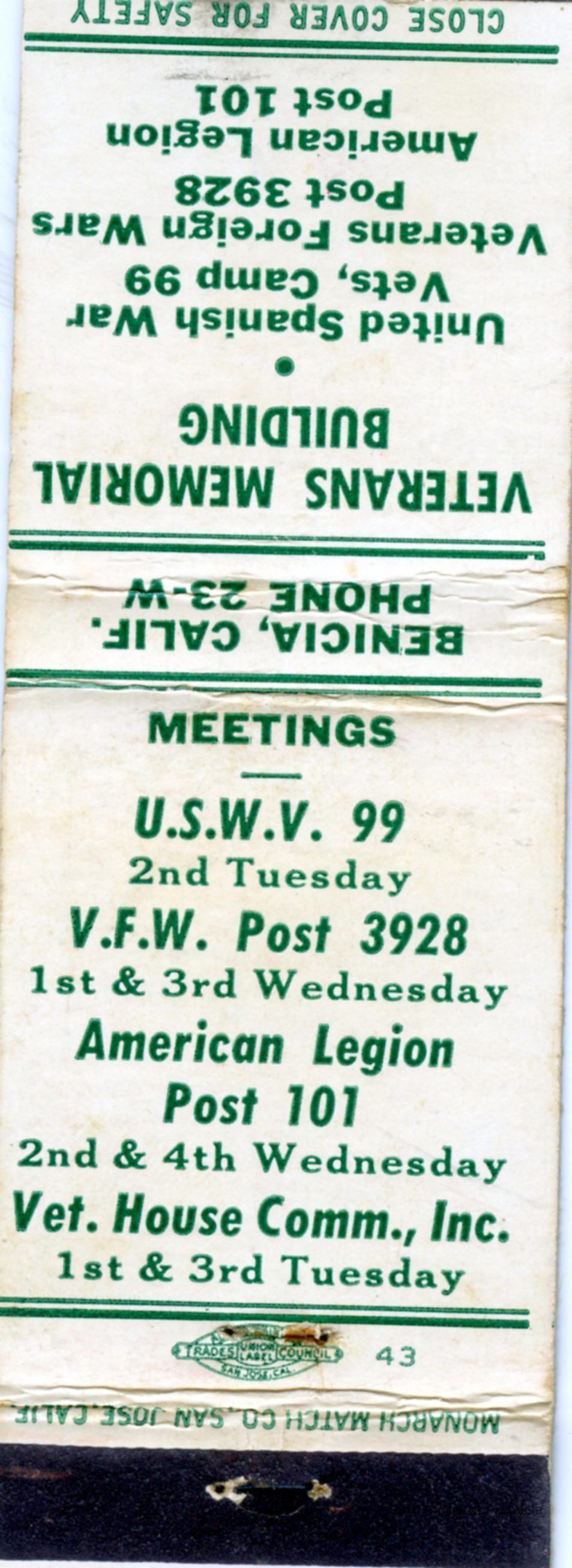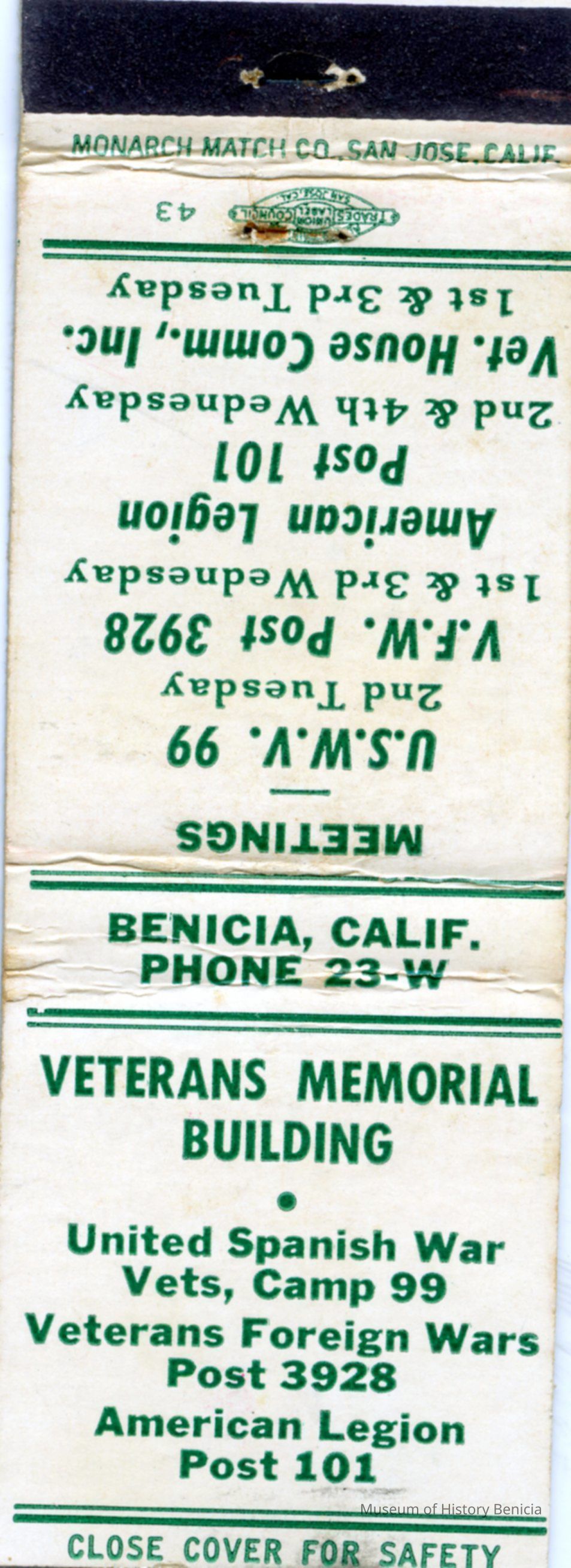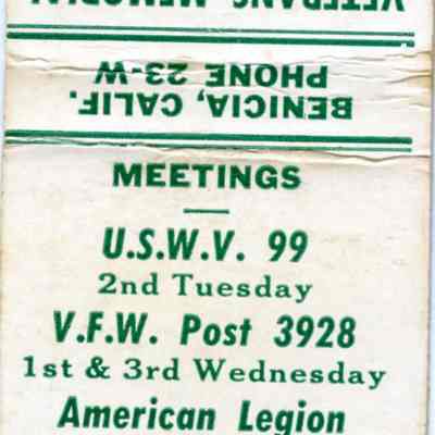 This is a matchbook from the Veterans Memorial Building in Benicia. The building and organization are still there.