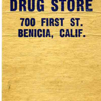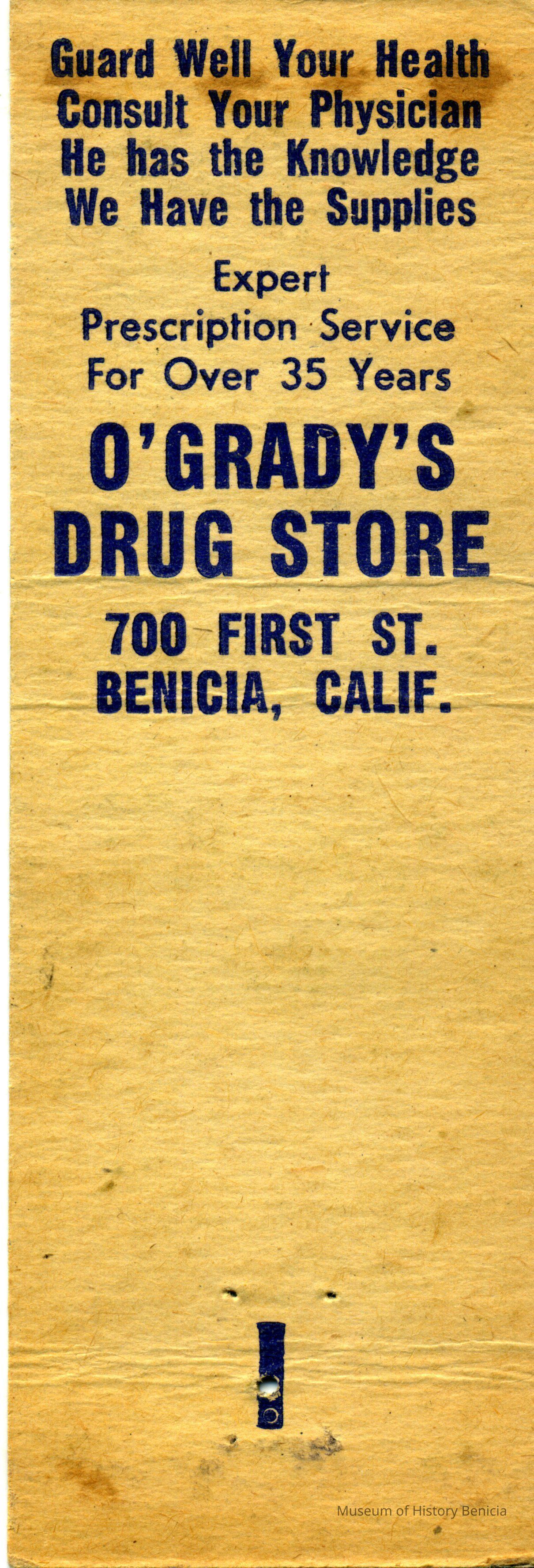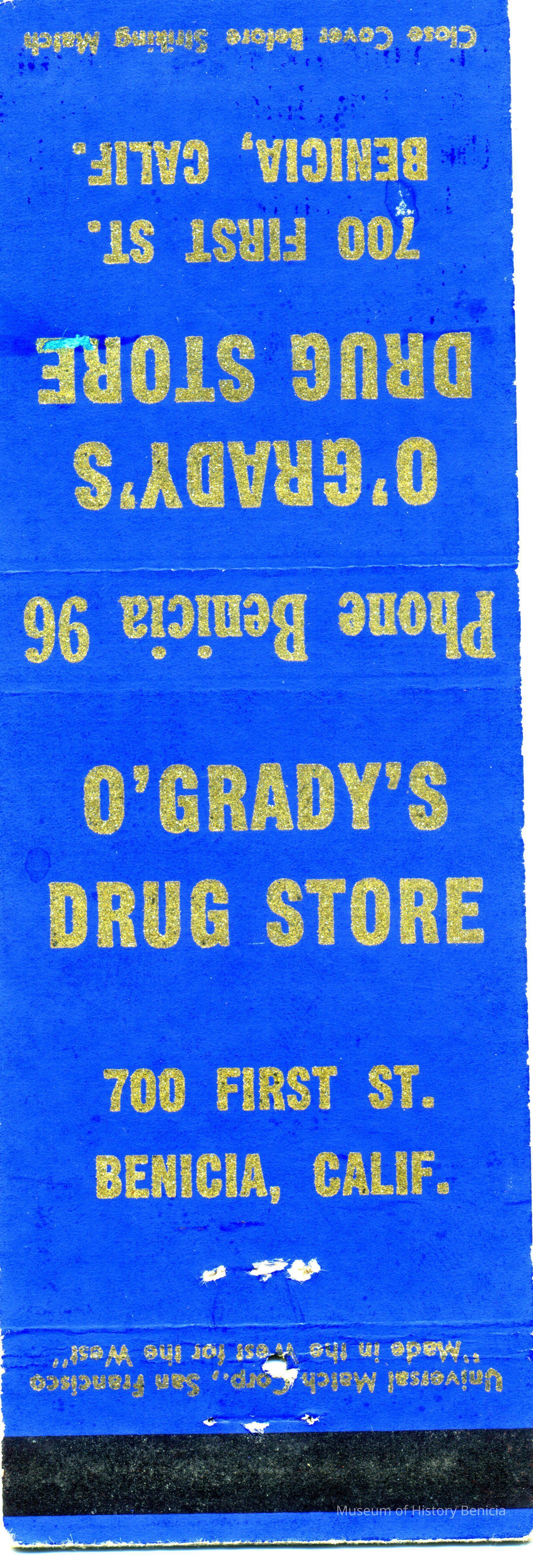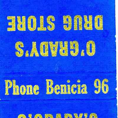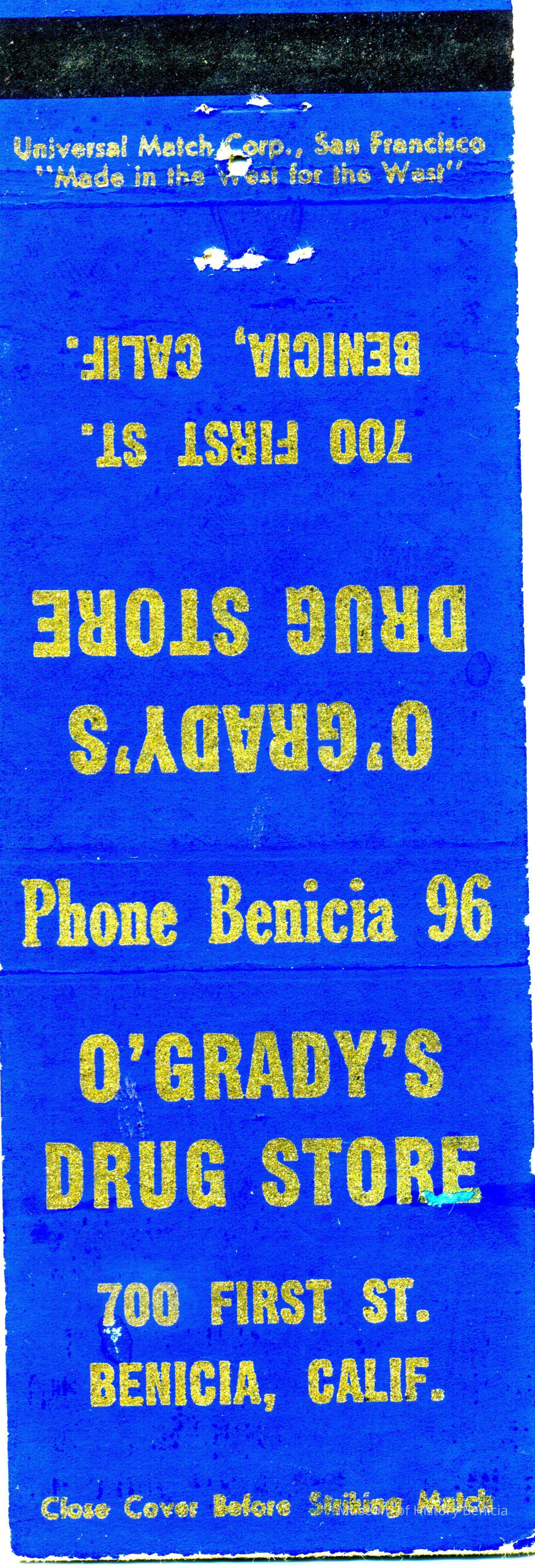 This is a matchbook cover for O'Grady's Drug Store at 700 First Street Benicia. It was owned by Jack O'Grady. The cover just gives the store name address and phone number. Inside it says: