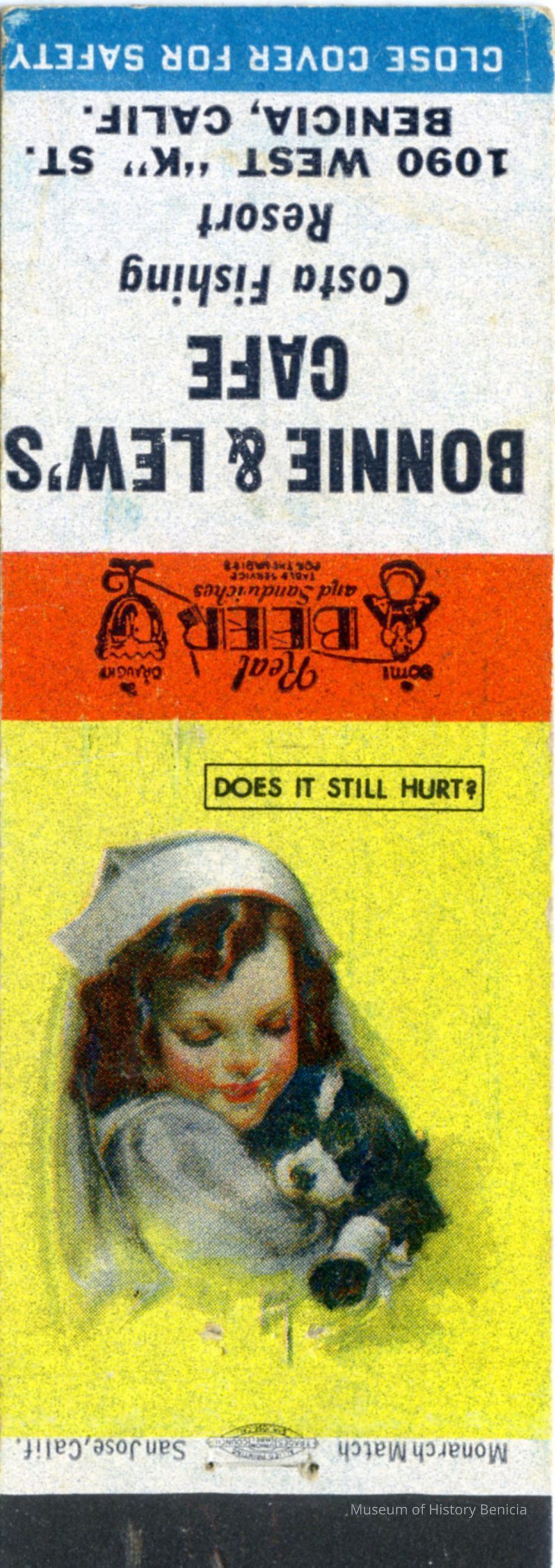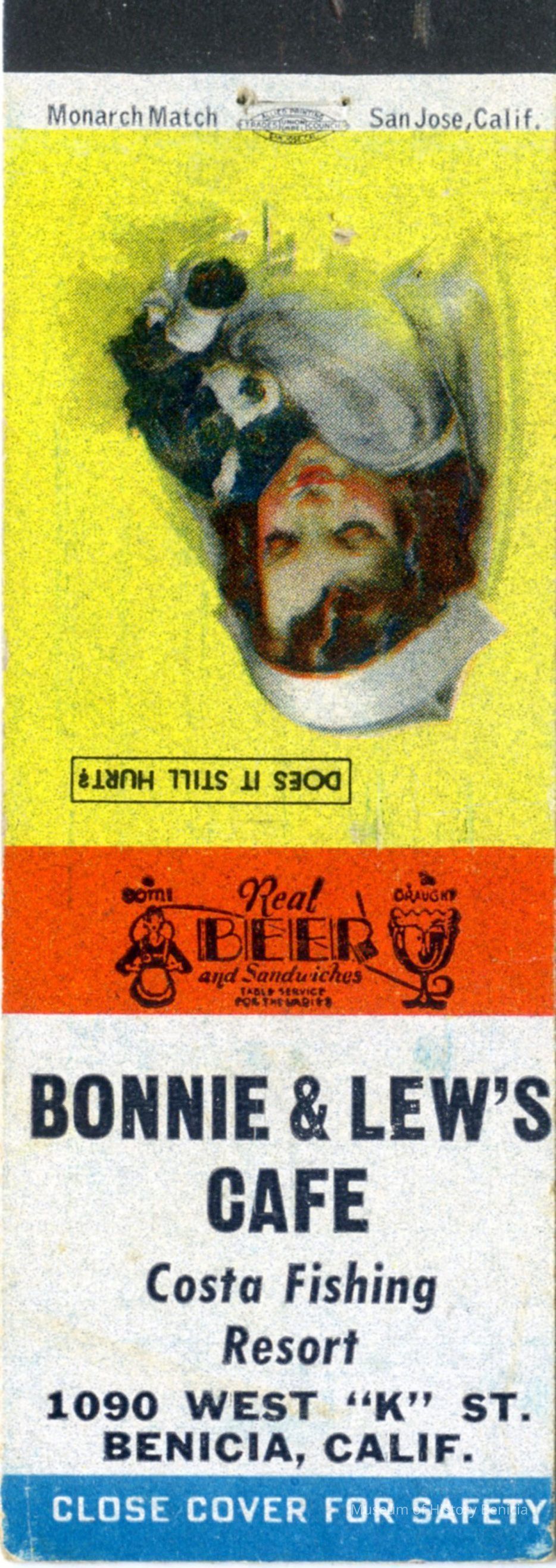 This is a matchbook from Bonnie & Lew's Cafe at the Costa Fishing Resort. The Costa Fishing Resort was at 1090 West K street in Benicia. The fishing resort was started by Manuel Costa who lived at 1080 W. K st. (see record 2020.005.0026). The people running the cafe may be his children or grandchildren.Collection