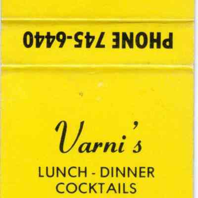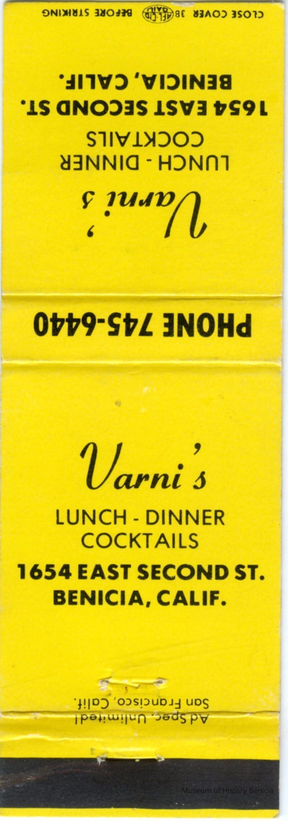 This is a matchbook from Varni's at 1654 East Second Street Benicia CA. This is where Kimono restaurant is now and Pappa's before that and the Mallard House even earlier. Not sure when it was Varni's.Collection