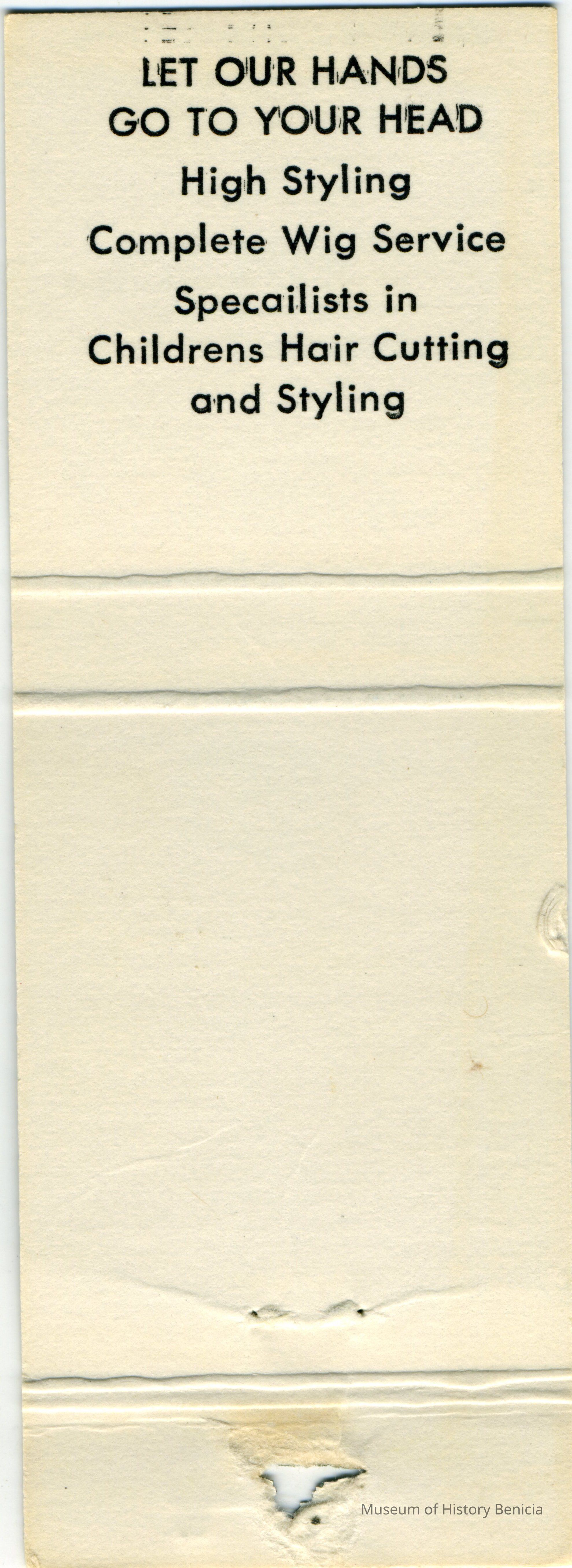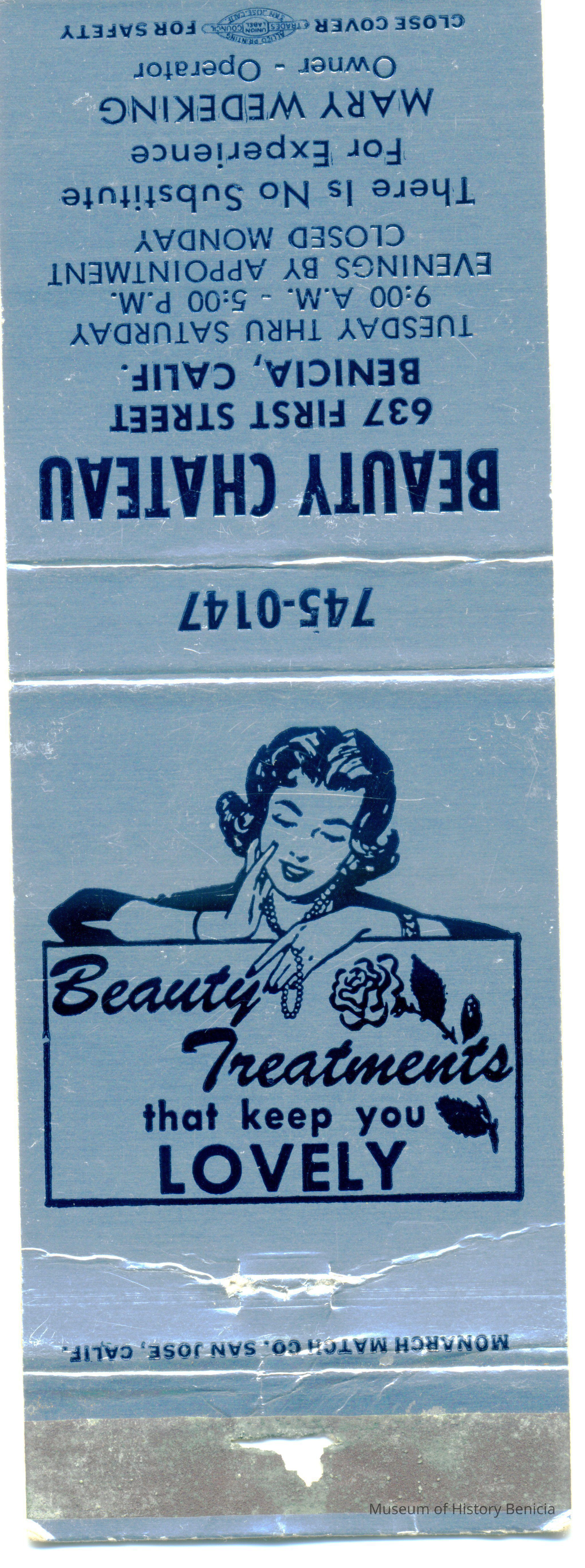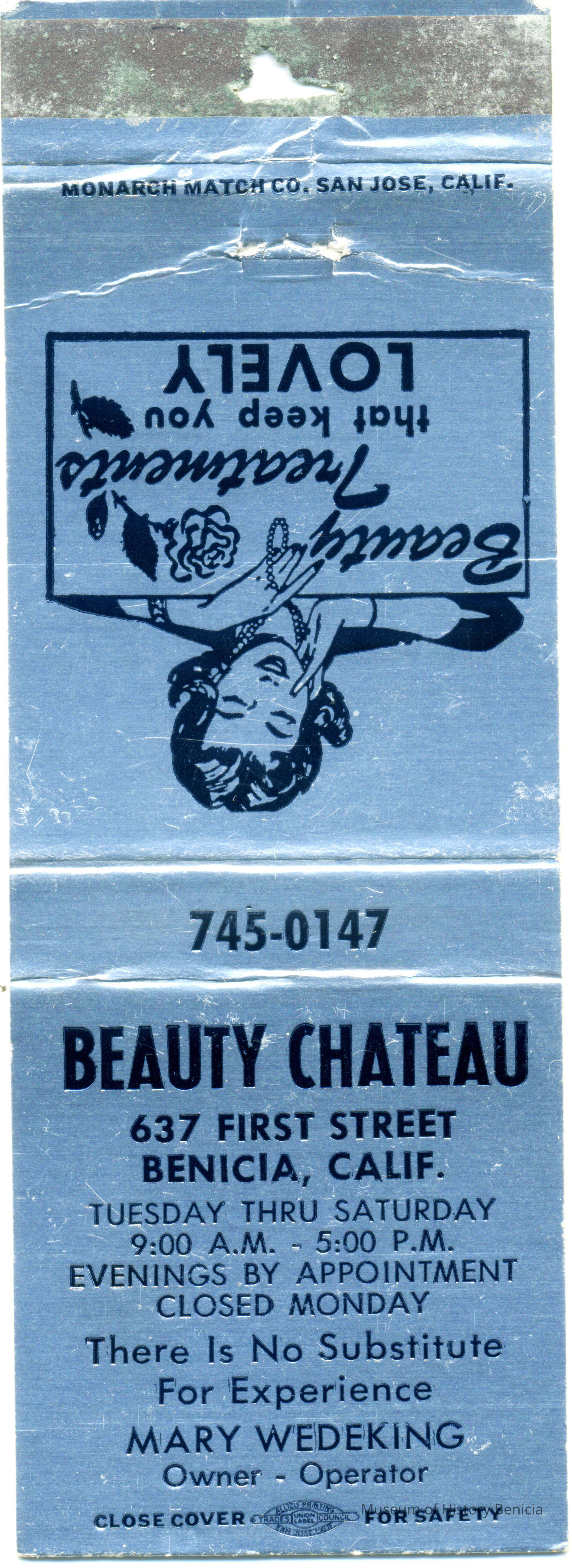 This is a matchbook cover for The Beauty Chateau at 637 First Street Benicia. It was owned by Mary Wedeking. The cover says "Beauty Treatments that keep you Lovely". Inside it says "let our hands go to your head". Also,