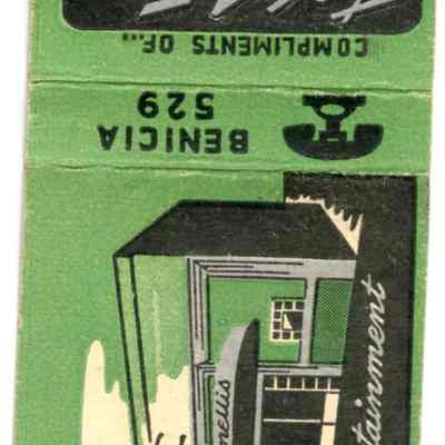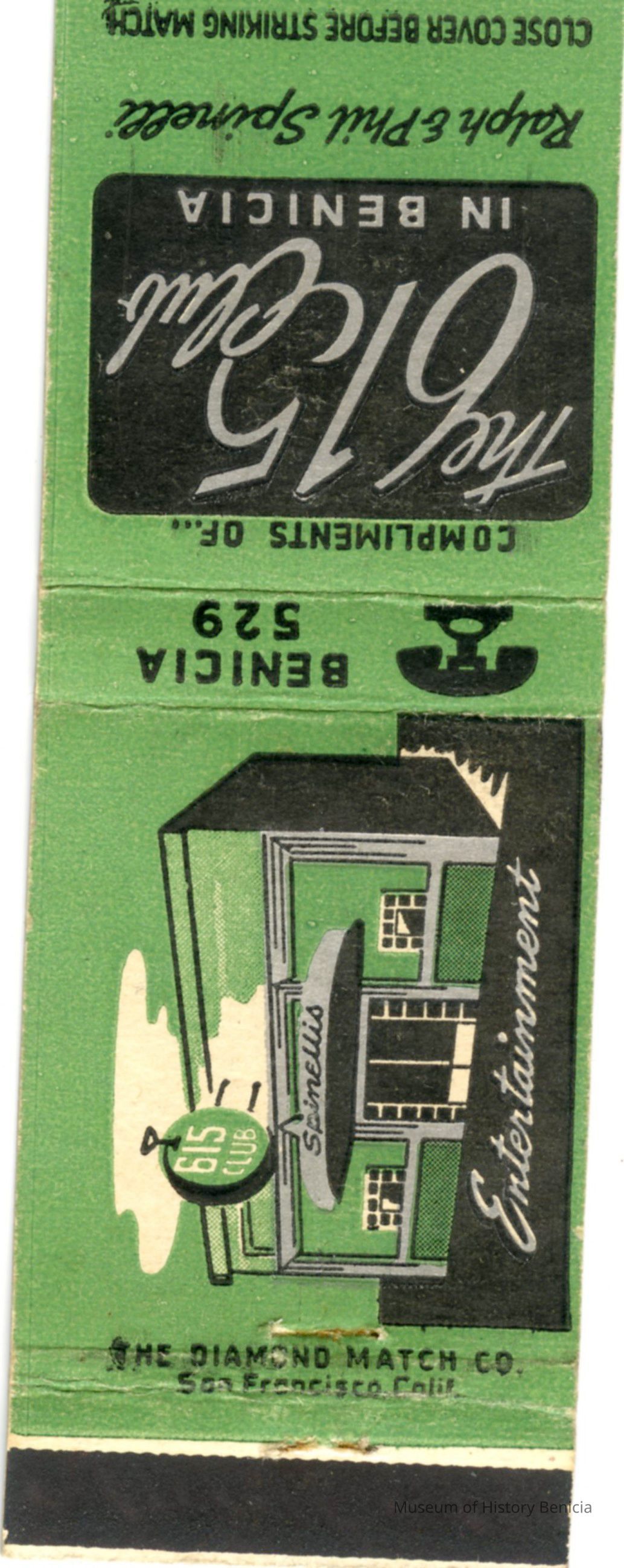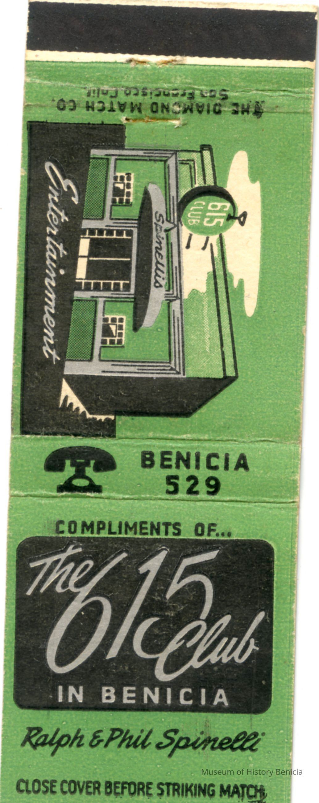 This is a matchbook from the "615 Club" in Benicia at 615 First Street. It is green with a drawing of the business on one side and the name of the business and owners, Ralph & Phil Spinelli, on the other side. At one time it was owned by Urban Braito.