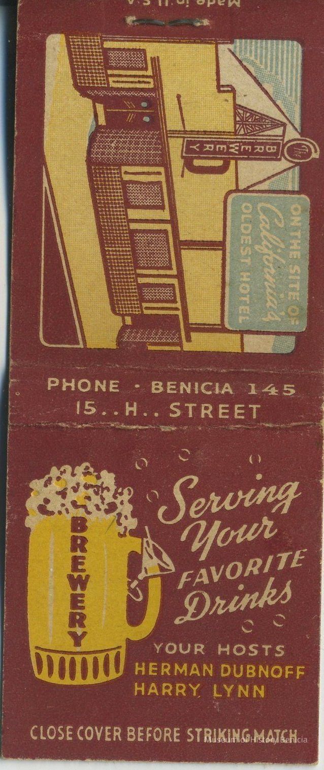 Front: Glass of Beer logo with "Brewery" on the glass; "Serving your favorite Drinks / Your Hosts Herman Dubnoff / Harry Lynn" "Close cover before striking match."