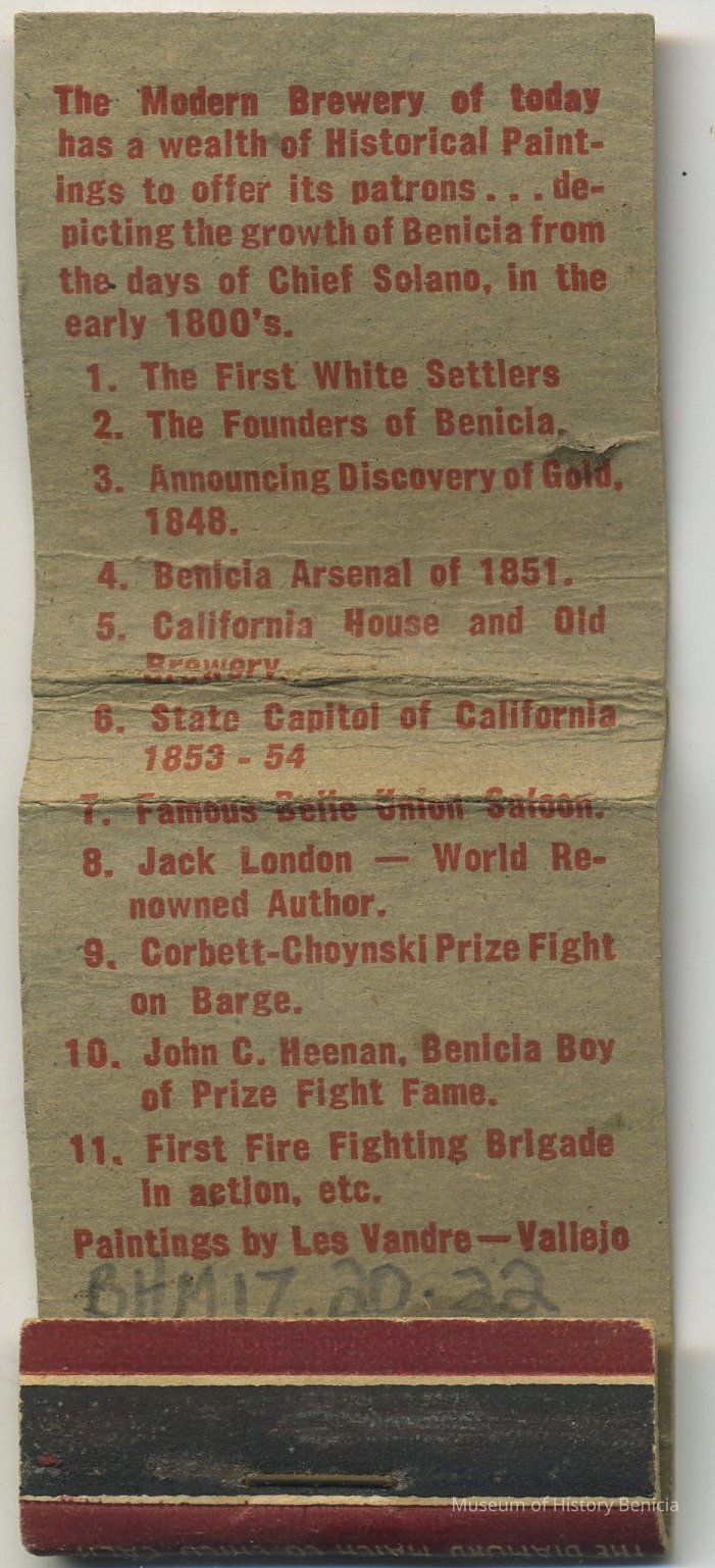 1. The First White Settlers; 2. The Founders of Benicia; 3. Announcing Discover of Gold, 1848; 4. Benicia Arsenal of 1851; 5. California House and Old Brewery; 6. State Capitol of California 1853-54; 7. Famouse Bella Union Saloon; 8. Jack London - World Renowned Author; 9. Corbett-Choynski Prize Fight on Barge; 10. John C. Heenan, Benicia Boy of Prize Fight Fame; 11. First Fire Fighting Brigade in action, etc.