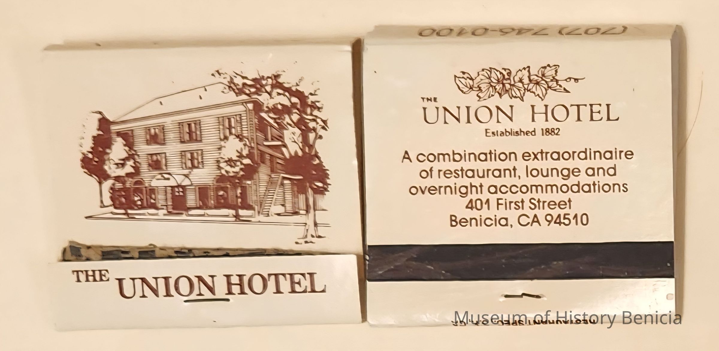 The Union Hotel, A combination extraordinaire of restaurant, lounge and overnight accommodations, 401 First St, Benicia CA. 94510- Beige + brown cover.