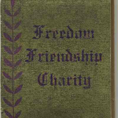 Back: "Freedom / Friendship / Charity" purple ink on gold background