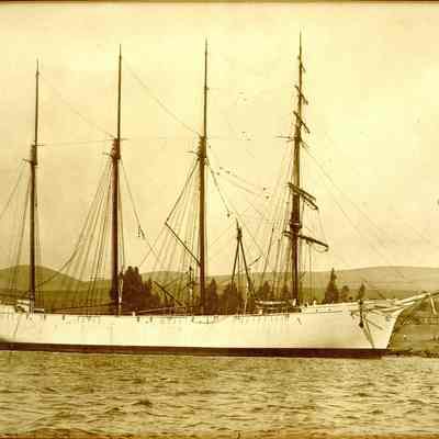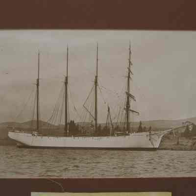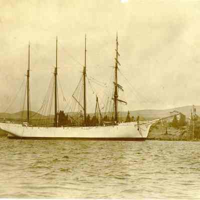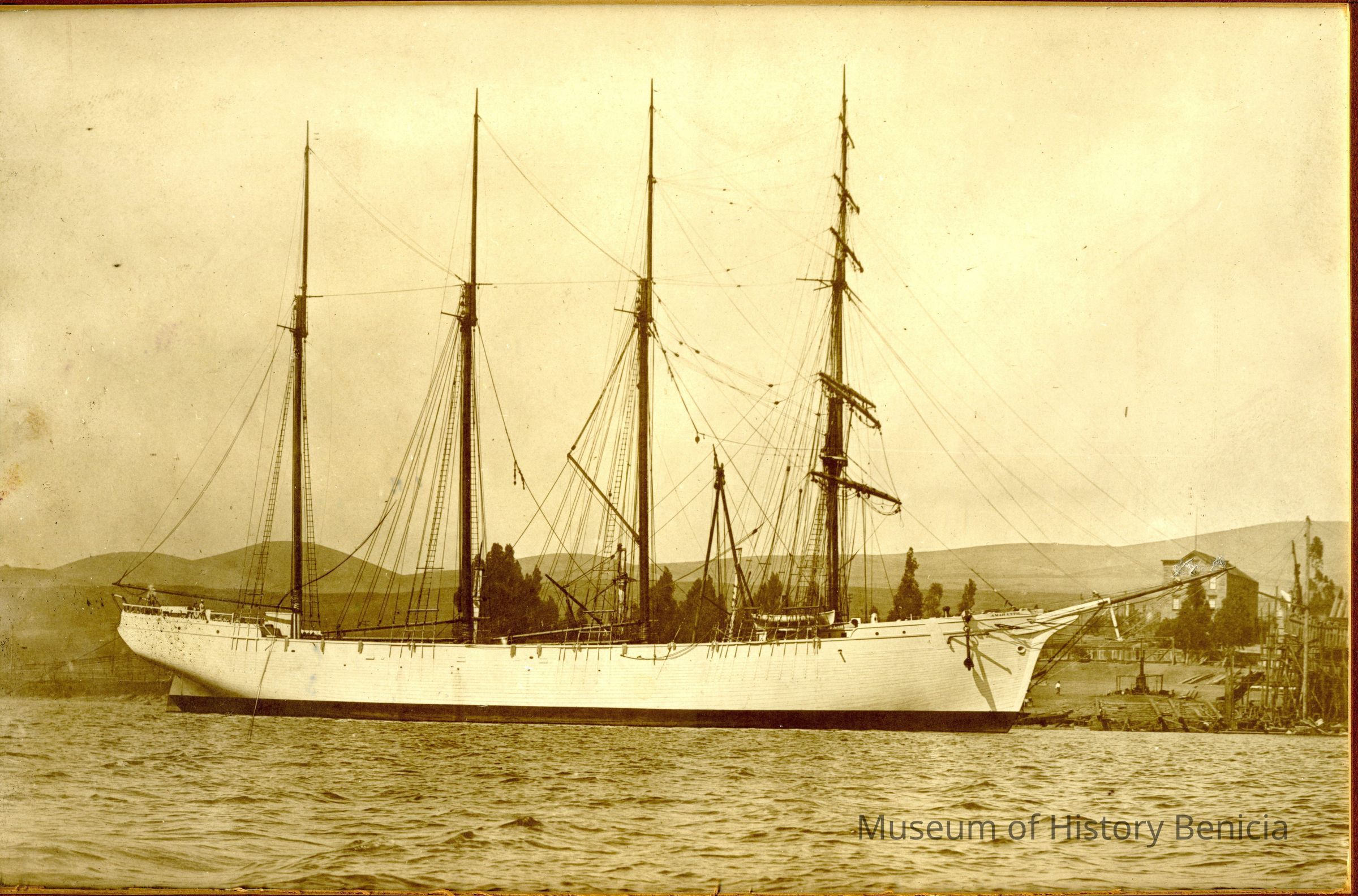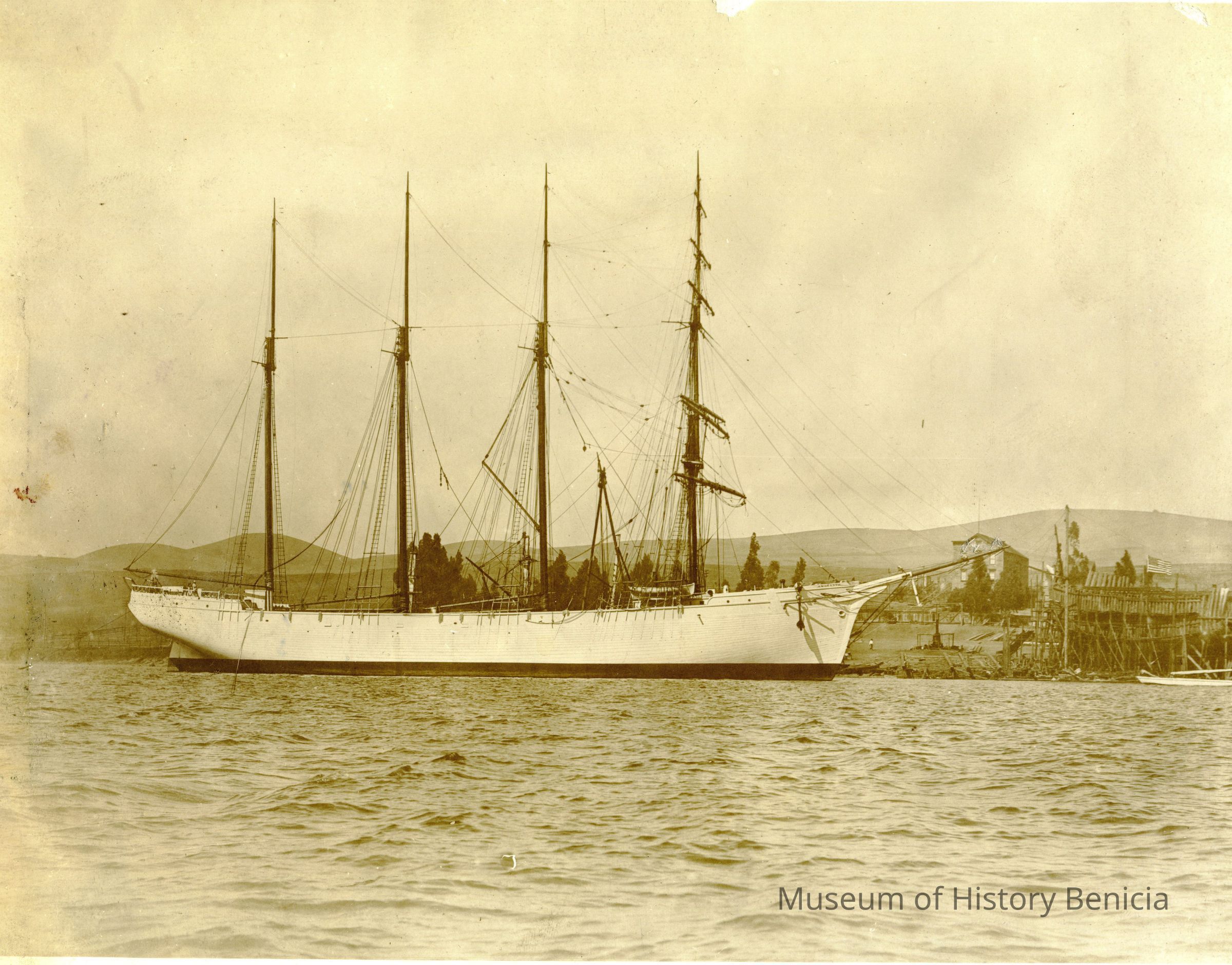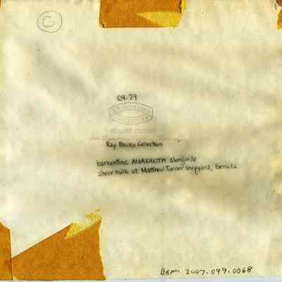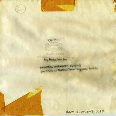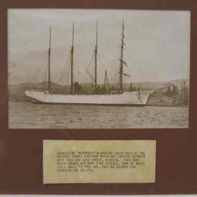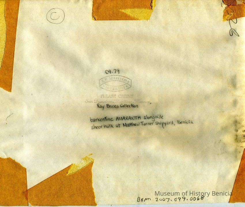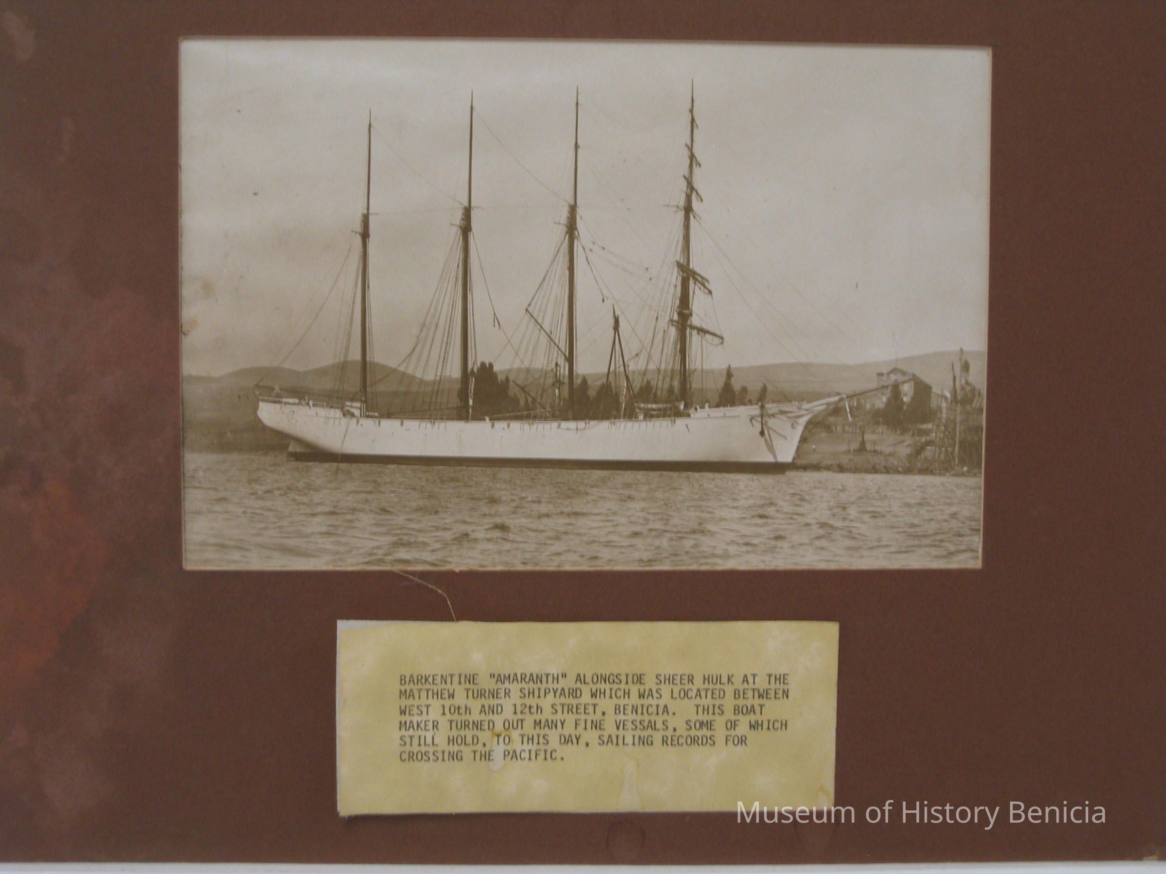Sepia toned photograph of a four masted ship with a caption below that reads "Barkentine "Amaranth" alongside sheer hulk at the Matthew Turner Shipyard which was located between WEst 10th and 12th Streets, Benicia. This Boat maker turned out many fine vessels, some of which still hold, to this day, sailing records for crossing the Pacific."Collection