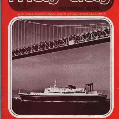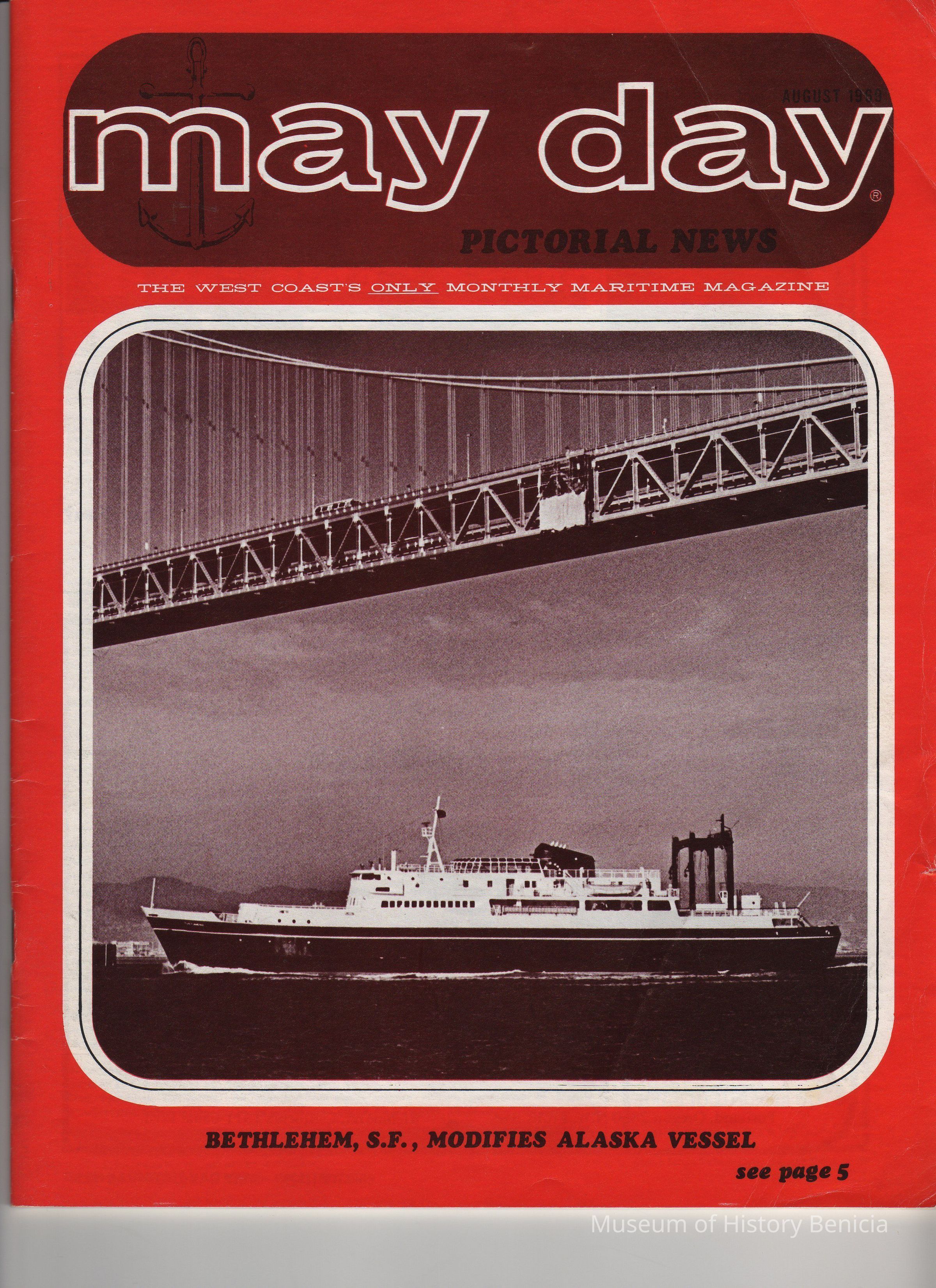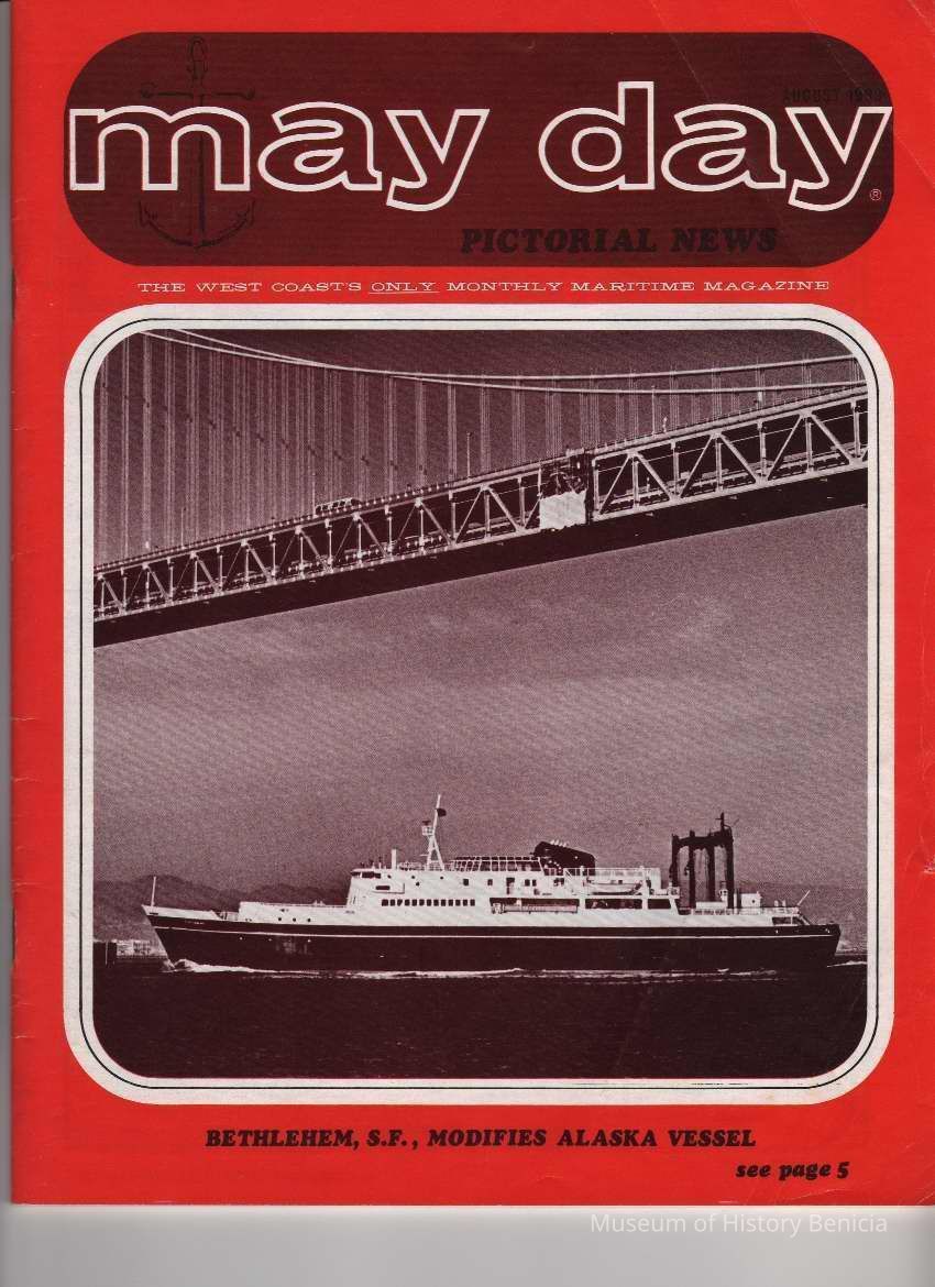 "May Day/pictoral news/August 1969" vol. 9, No. 7. Orange and brown and white paper covers with photo of ferry under a bridge.