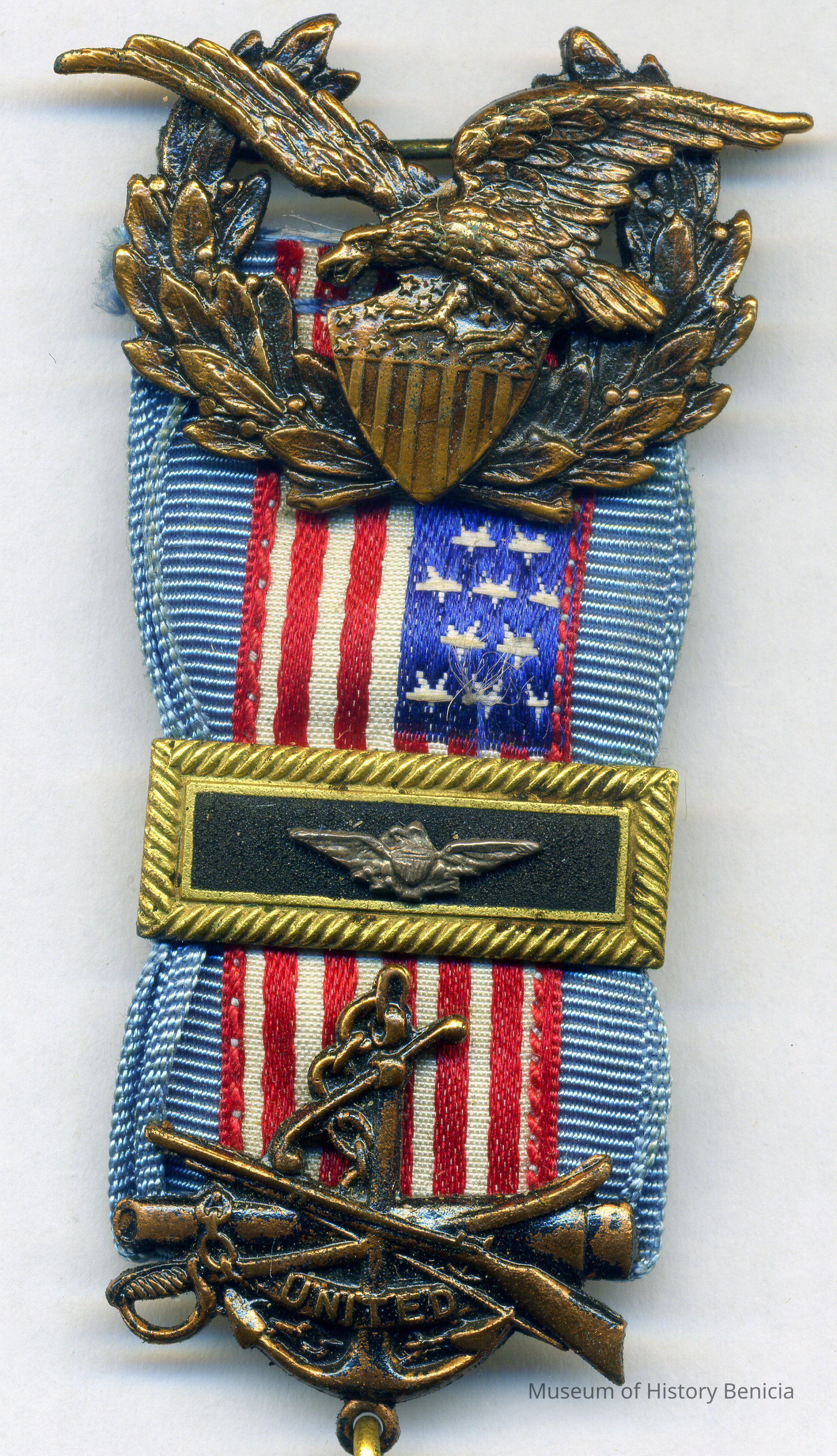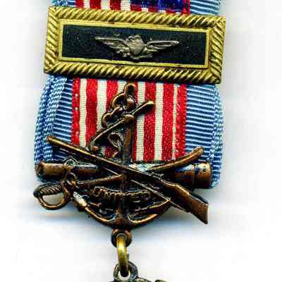 This medal has blue edging around the American flag. It also has an officer's bar across the flag.