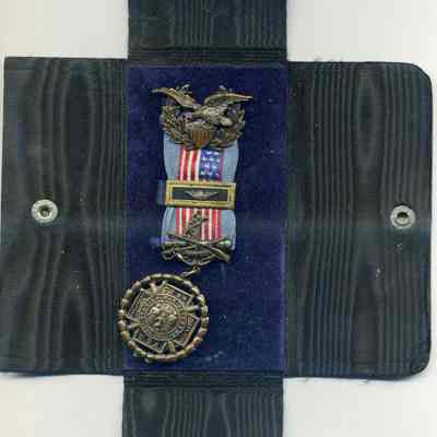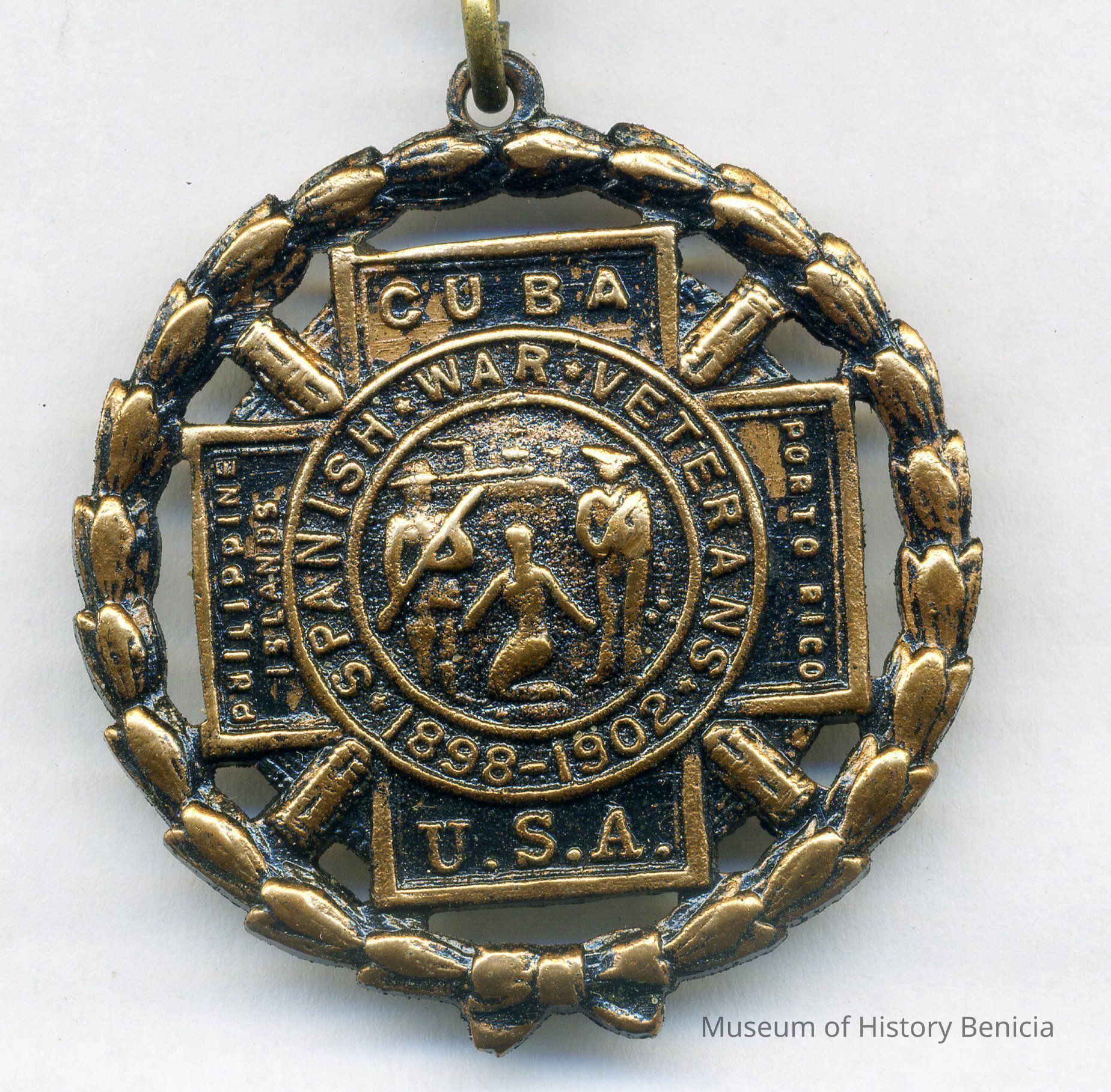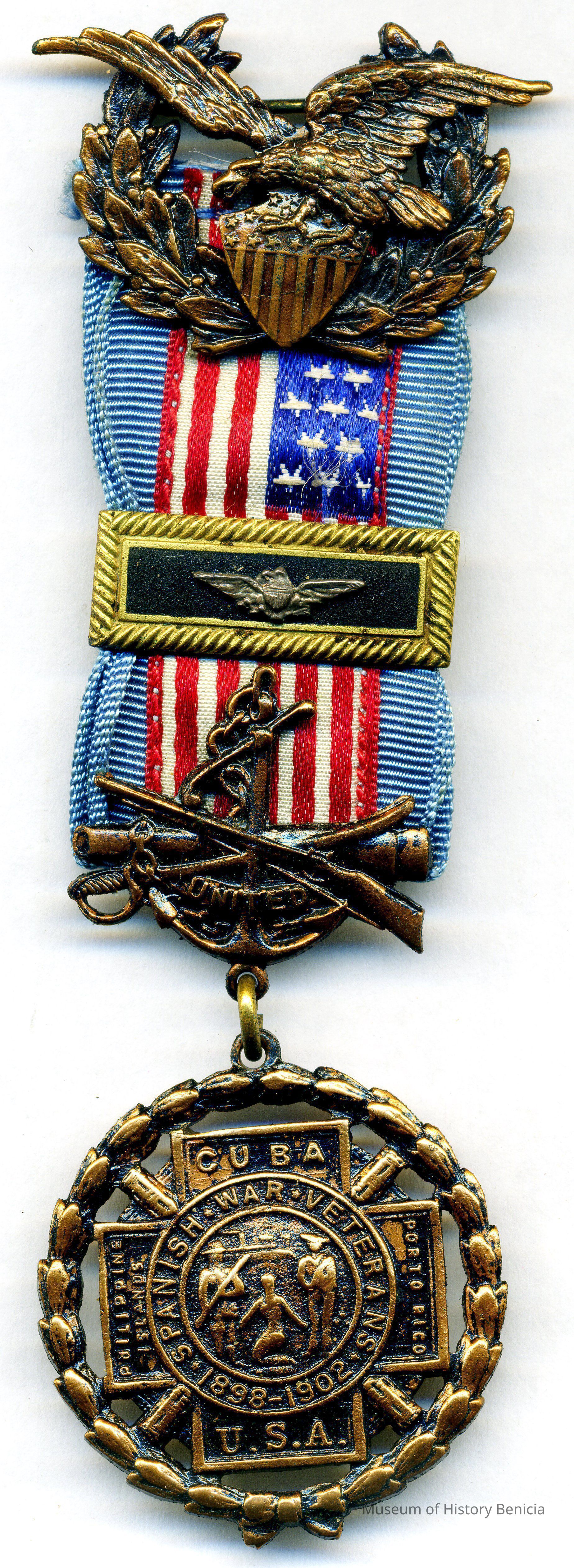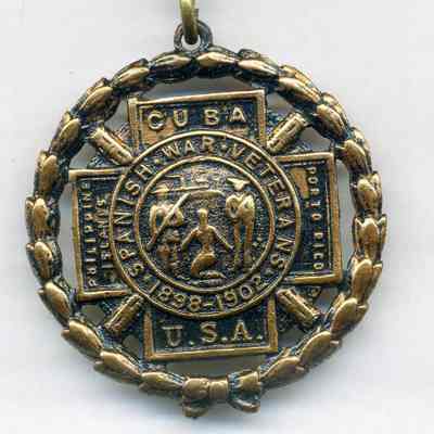 Dangling at the bottom of the medal is the Spanish American War cross, with the four arms reading "Porto Rico," "Cuba," "Philippines," with "USA" at the bottom. "Porto Rico" was the current spelling of Puerto Rico at the turn of the century. The dates on the cross read 1898-1902 with the words "Spanish War Veteran." The Spanish American War began and ended in 1898. The Philippine American War began in 1899 and continued into 1902, though some actions still occurred as late as 1906.