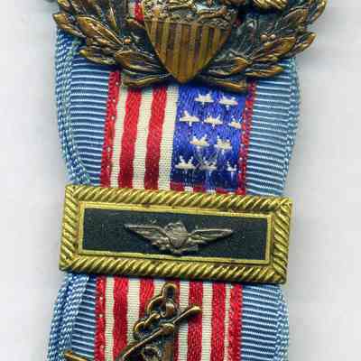 Original United Spanish War Veteran Member Medal for Past Post Commander, Camp Level. Not numbered on the combined forces insignia. The flag ribbon is edged in blue, signifying a Camp Level rank. The Commander strap or “jewel” is at the middle of the ribbon, signifying a past rank. The wreath around the cross also signifies a past held rank. Measures approximately 1 1/2 inches across at the eagle. Measures approximately 4 1/4 inches from top to bottom. Anodized finish. Die struck, nice detail, old “c” style pin catch.Collection
