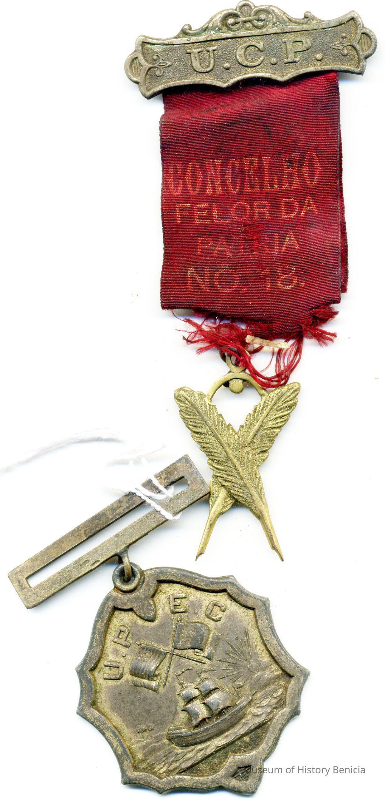 Medal (red) - says "Conselho Flor da Patria" No. 18. Top bar says U.C.P. and medal says U.P.E.C. Unido Portuguesa do Estado California (United Portuguese of the United States). There is a crossed feathers hanging from the top bar. The medal is separated into pieces.Collection