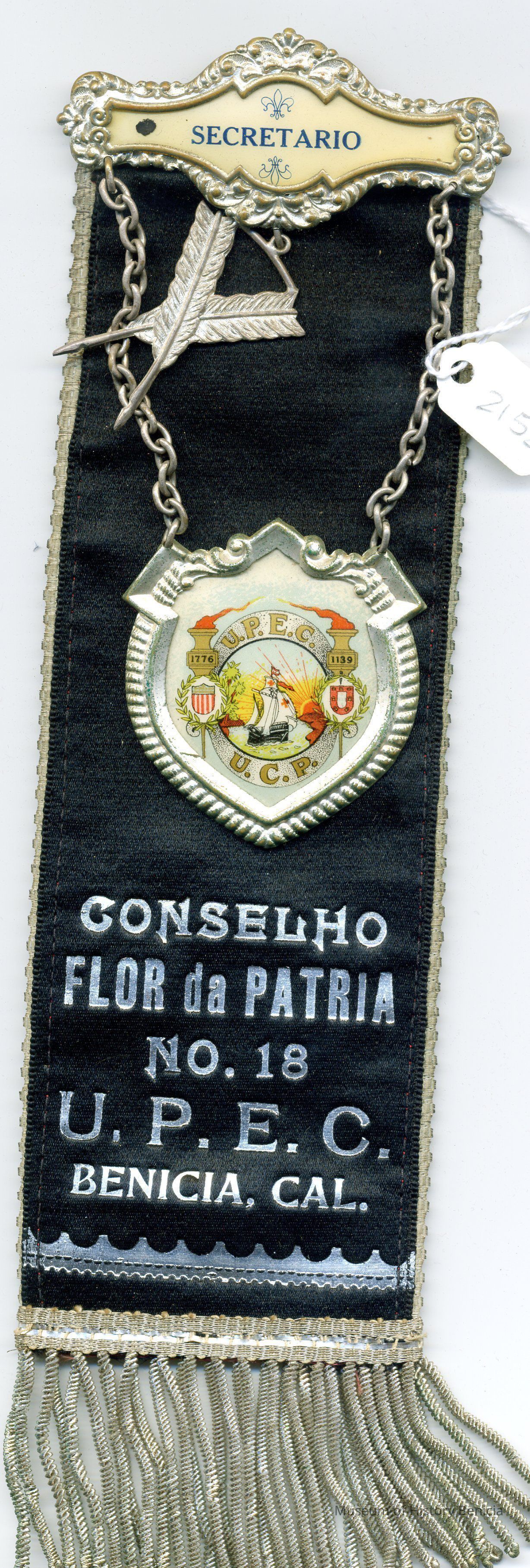 Medal (black) - says "Conselho Flor da Patria" No. 18 U.P.E.C Benicia Cal. Unido Portuguesa do Estado California (United Portuguese of the United States). There is a metal and ceramic badge for the UPEC hanging from the top bar. There is also a crossed feathers hanging down and the badge on the top says "Secretario".Collection