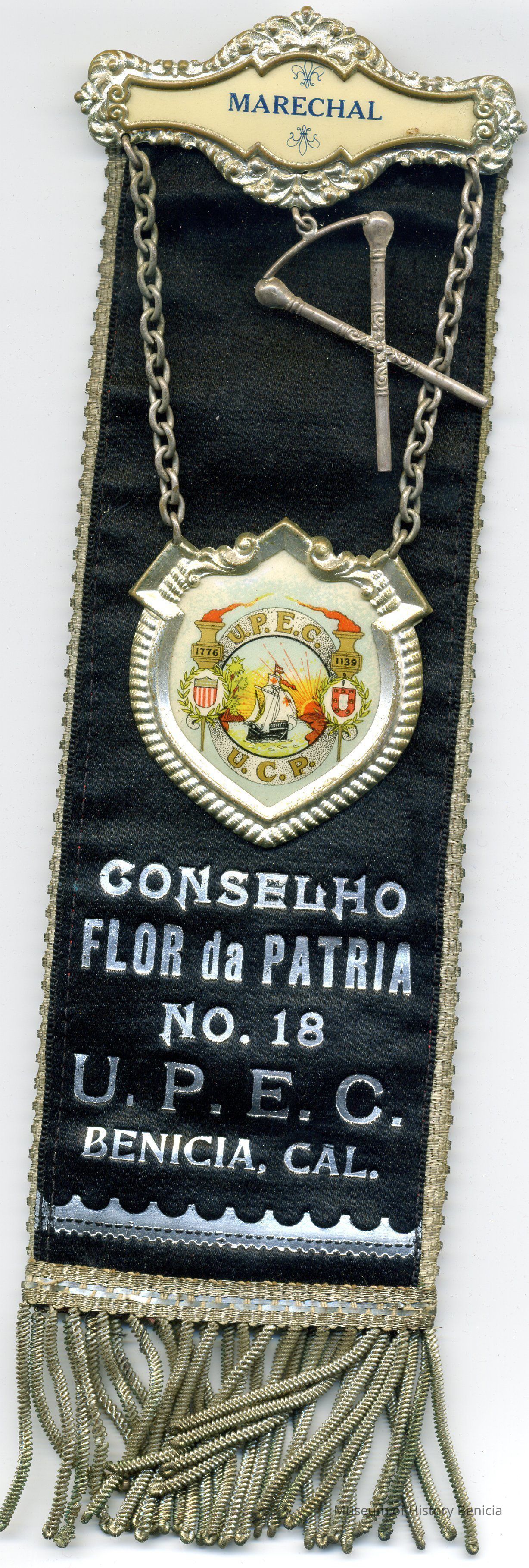Medal (black) - says "Conselho Flor da Patria" No. 18 U.P.E.C Benicia Cal. Unido Portuguesa do Estado California (United Portuguese of the United States). There is a metal and ceramic badge for the UPEC hanging from the top bar. There is also a crossed sticks hanging down and the badge on the top says "Marechal".Collection