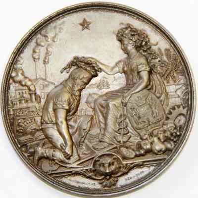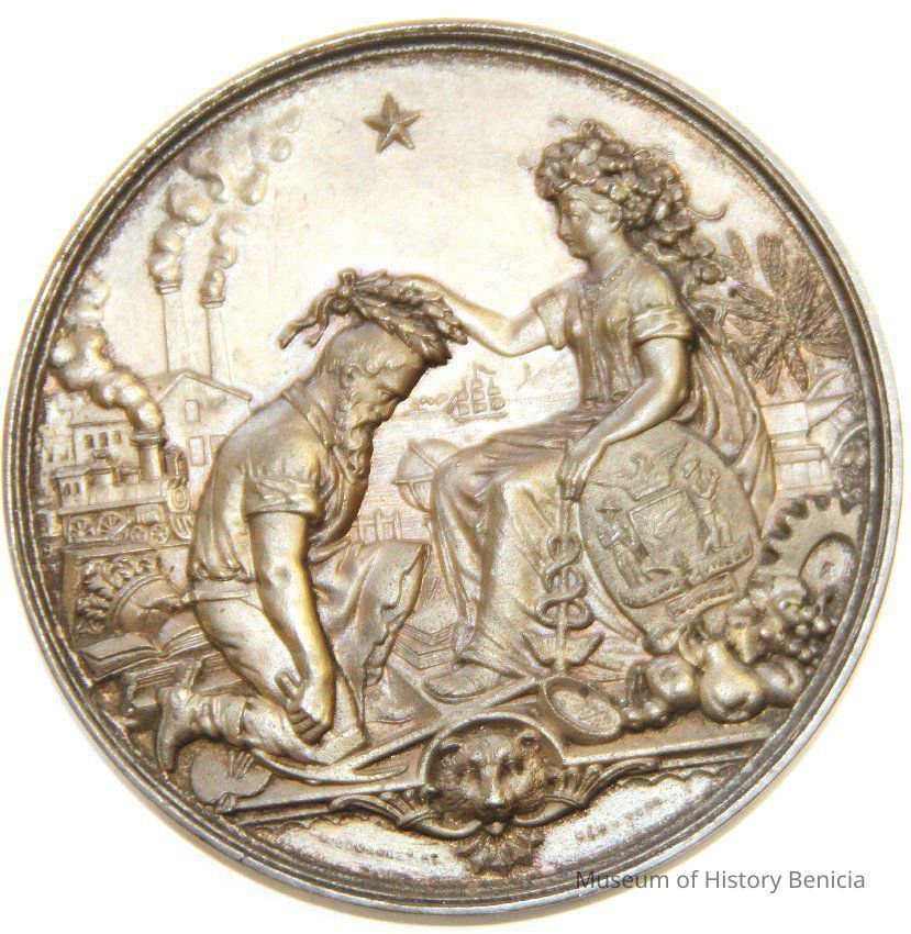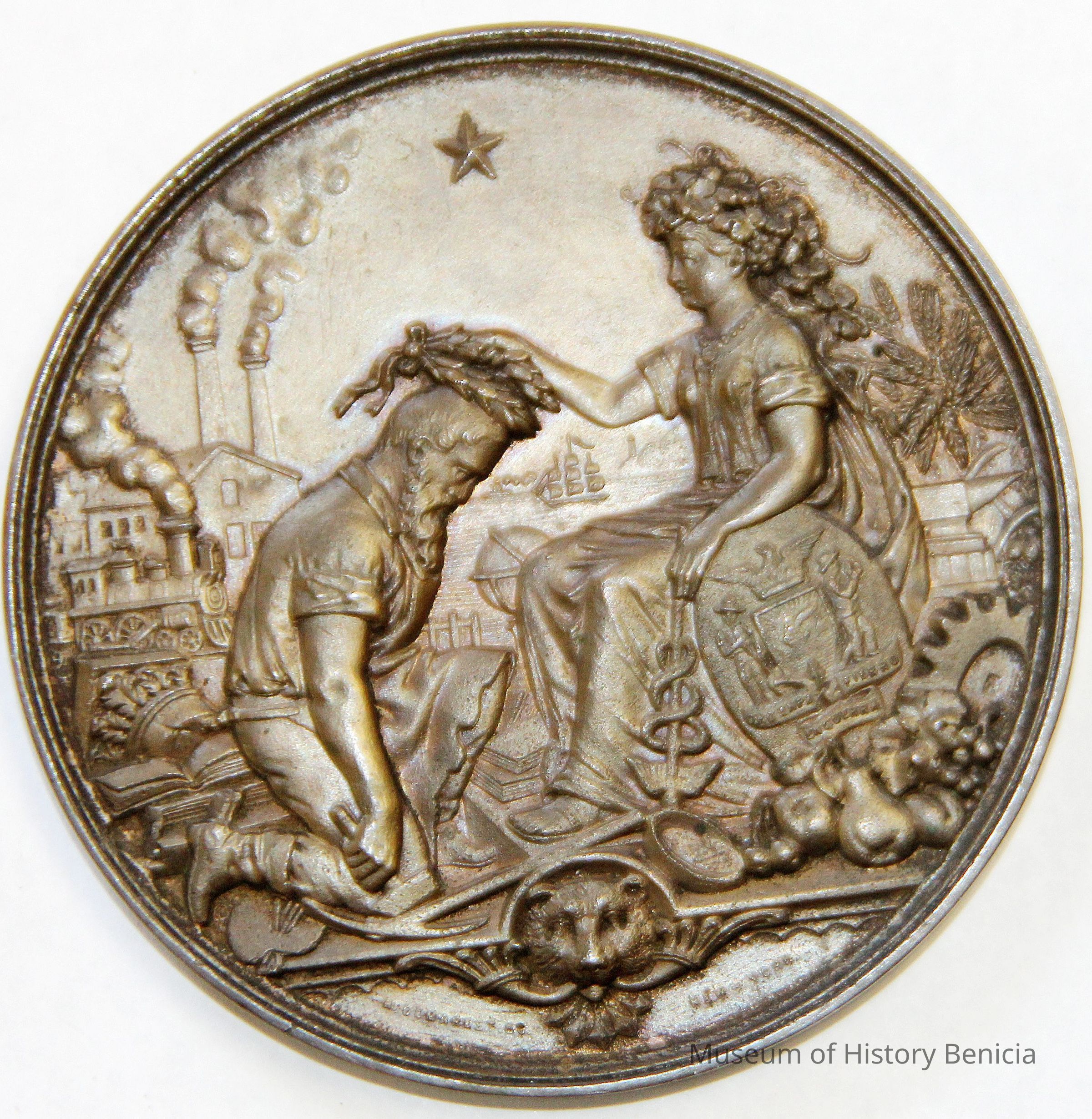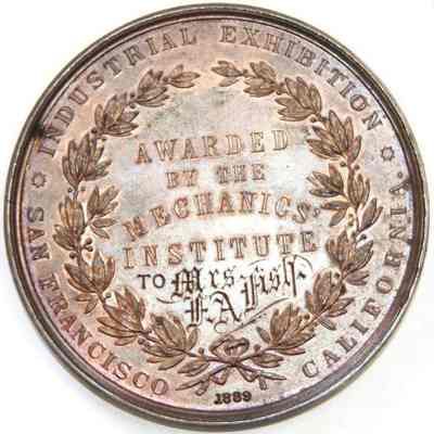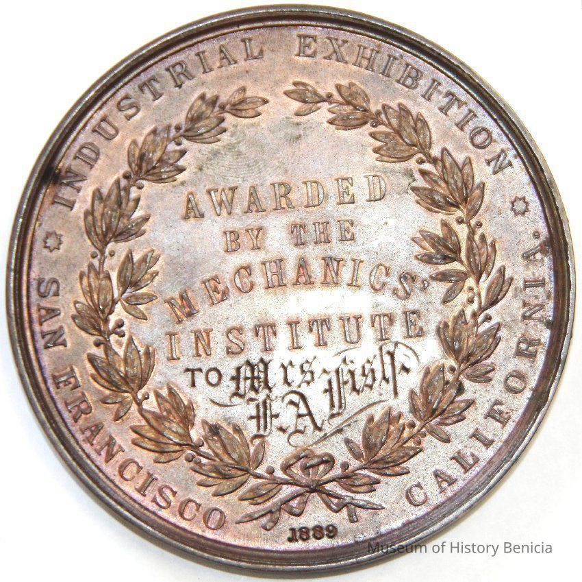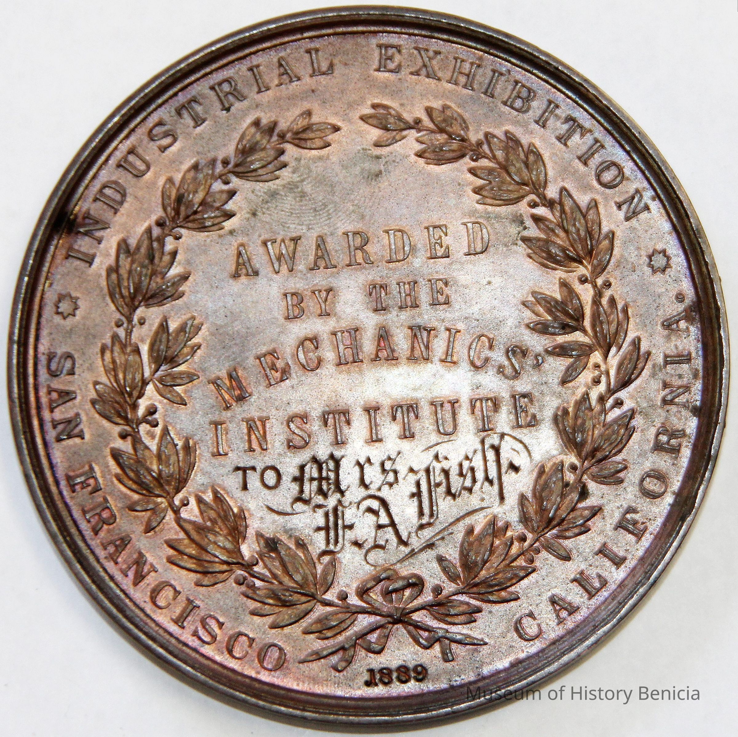 Medal awarded to Henrietta Riddell-Fish at the 1889 Mechanic's Institute Fair in San Francisco. She was awarded the medal for decorated art work. This is inscribed on the edge of the medal. Since it is larger than the other medals, it must be for her overall accomplishment. The medals were designed by the artist Charles Nahl.