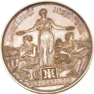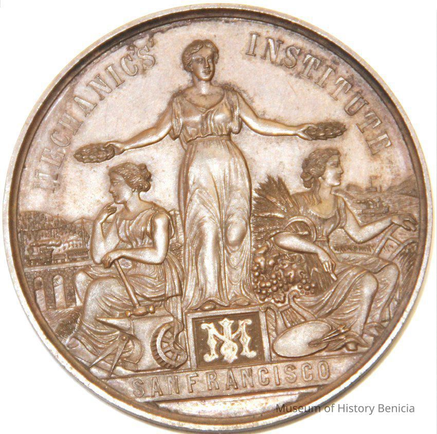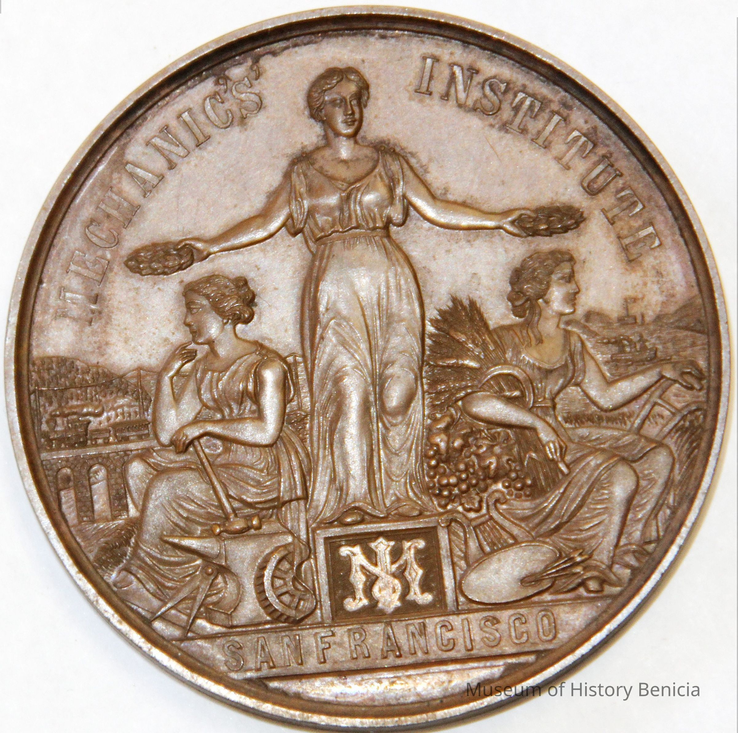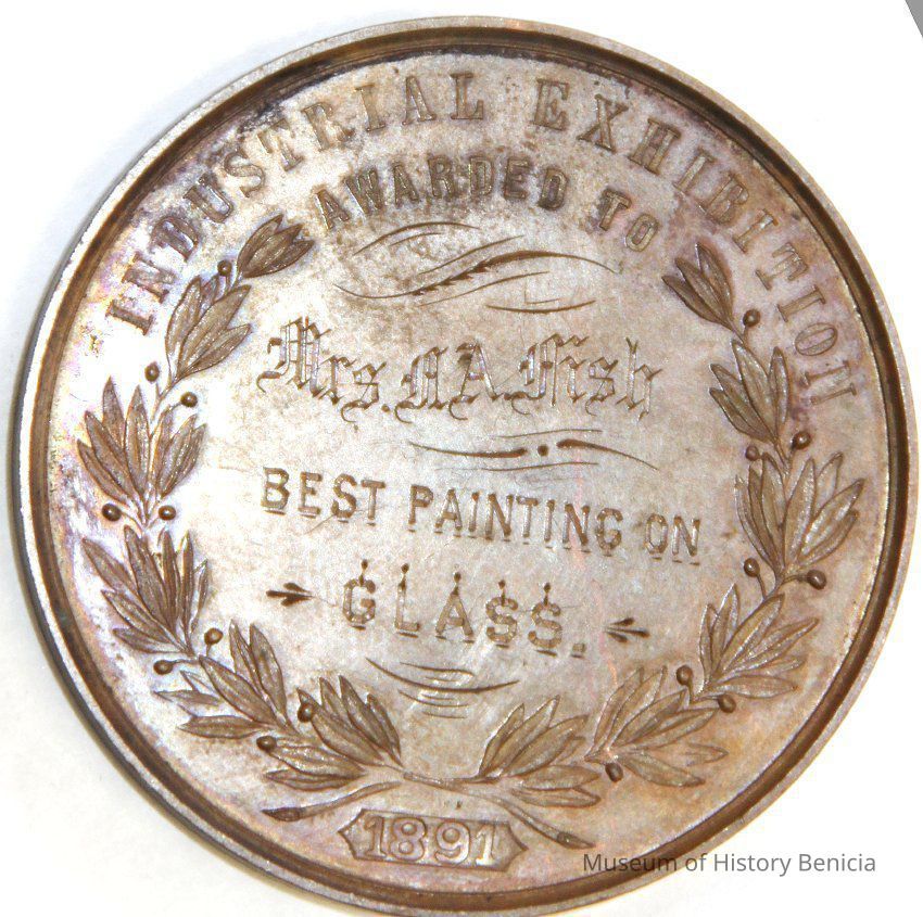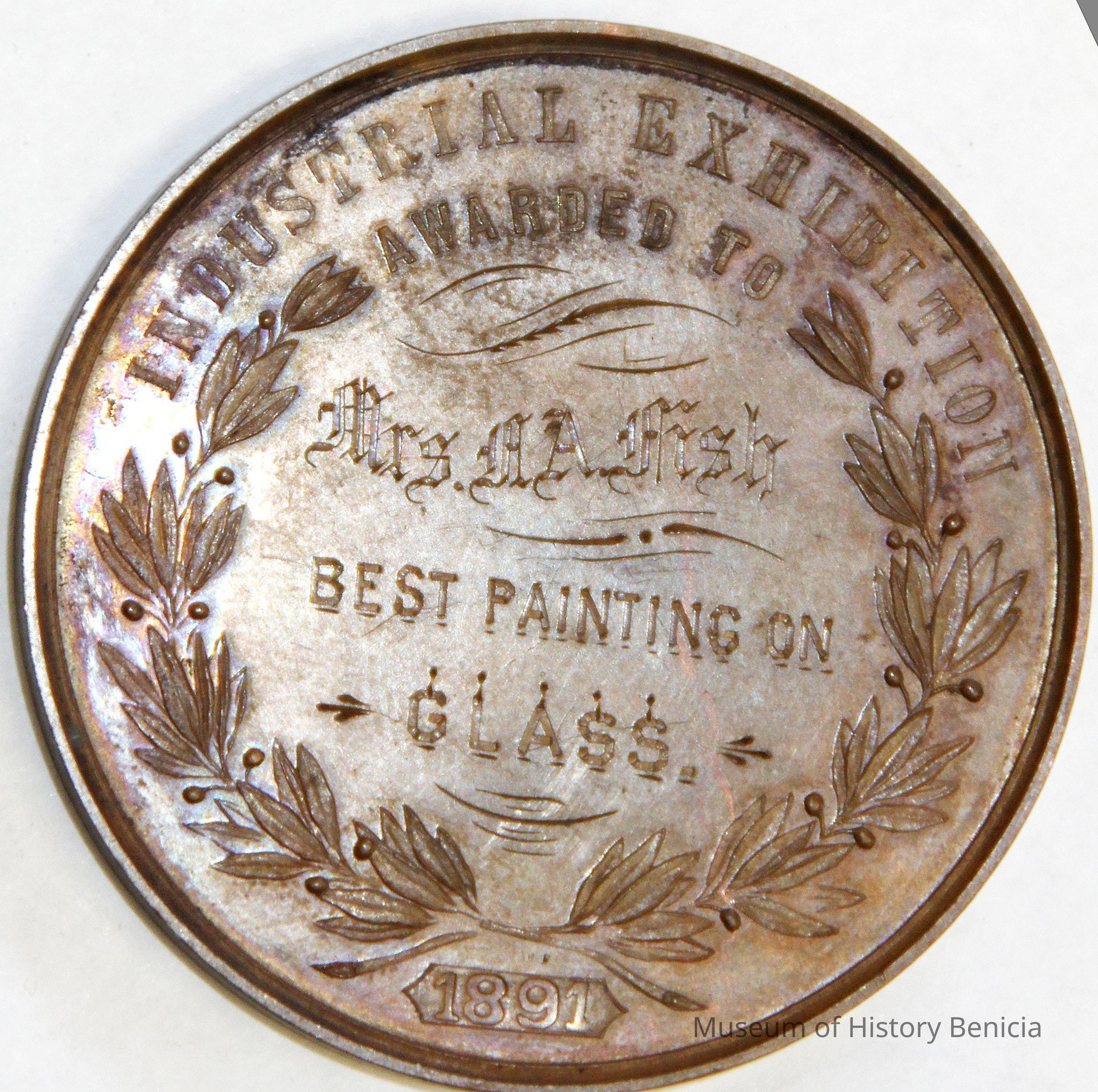 Medal awarded to Henrietta Riddell-Fish at the 1891 Mechanic's Institute Fair in San Francisco. She was awarded the medal for best painting on glass. The medals were designed by the artist Charles Nahl.