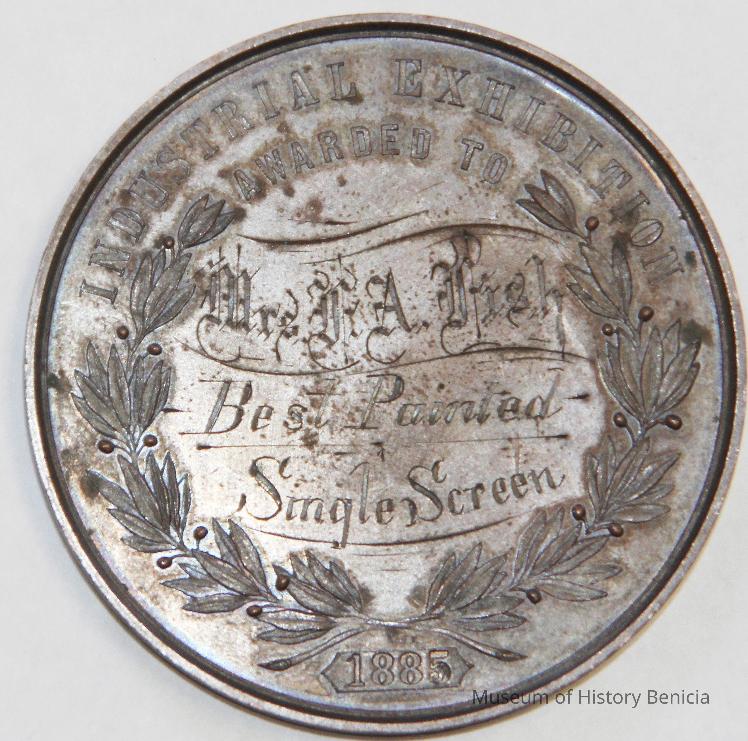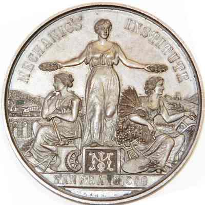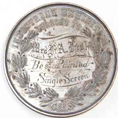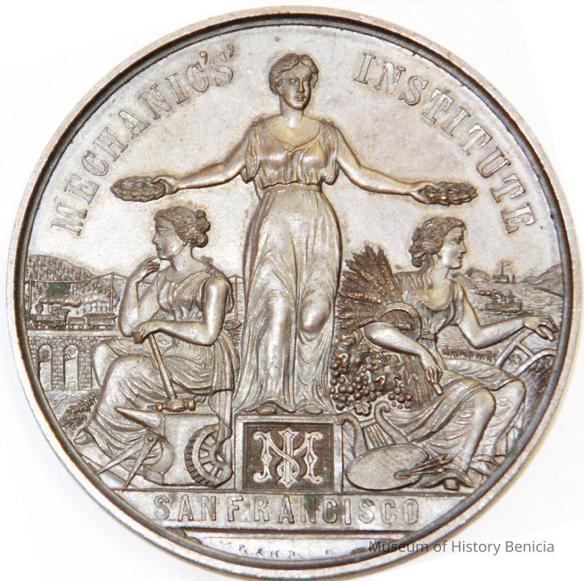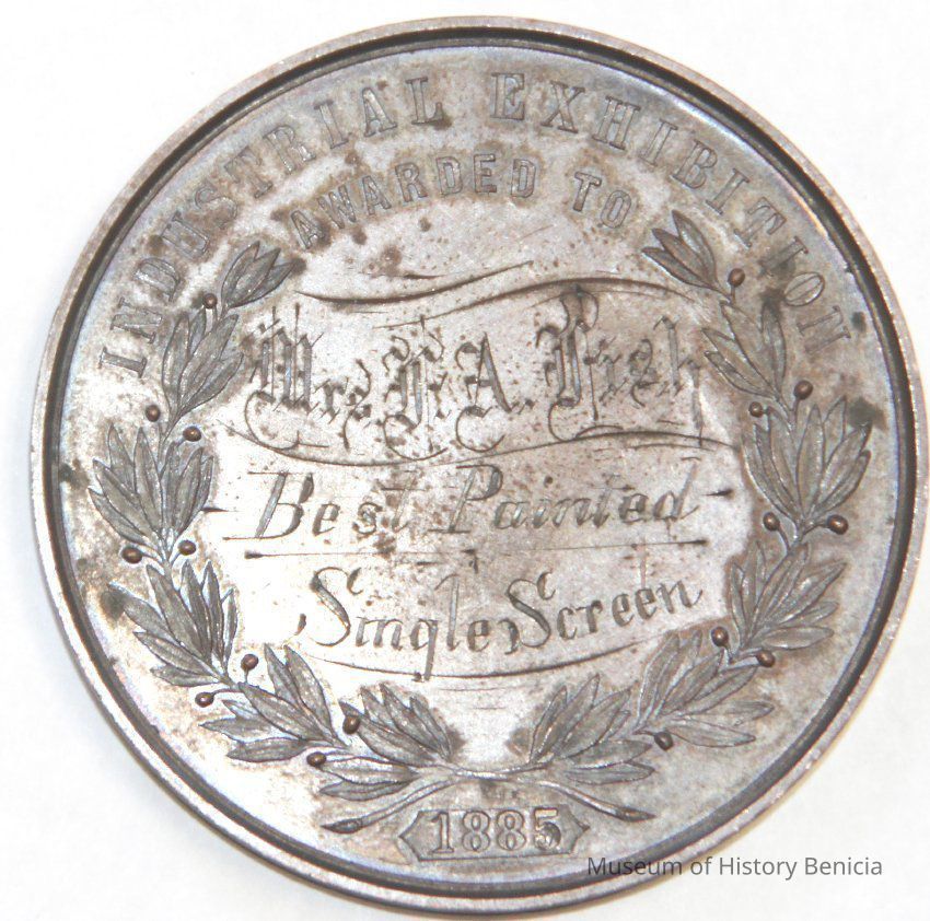 Medal awarded to Henrietta Riddell-Fish at the 1885 Mechanic's Institute Fair in San Francisco. She was awarded the medal for best painted single screen. The medals were designed by the artist Charles Nahl.