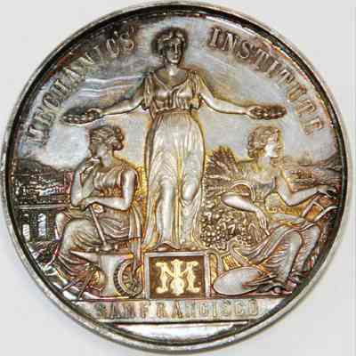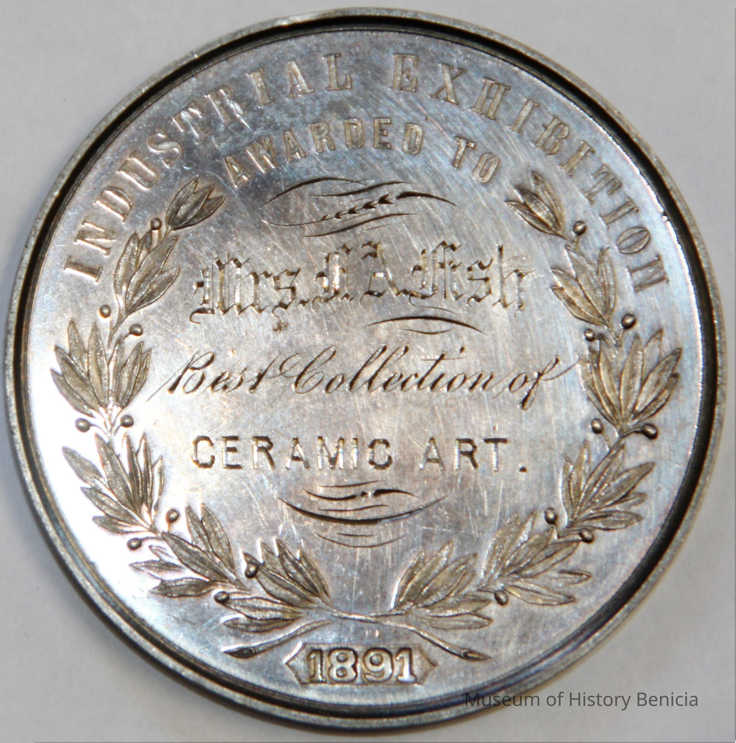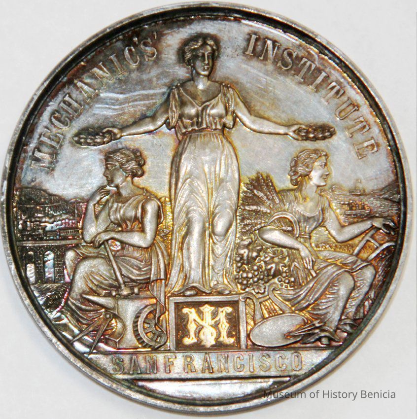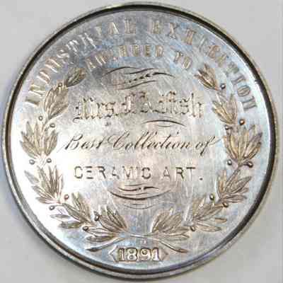 Medal awarded to Henrietta Riddell-Fish at the 1891 Mechanic's Institute Fair in San Francisco. She was awarded the medal for best collection of ceramic art. The medals were designed by the artist Charles Nahl.