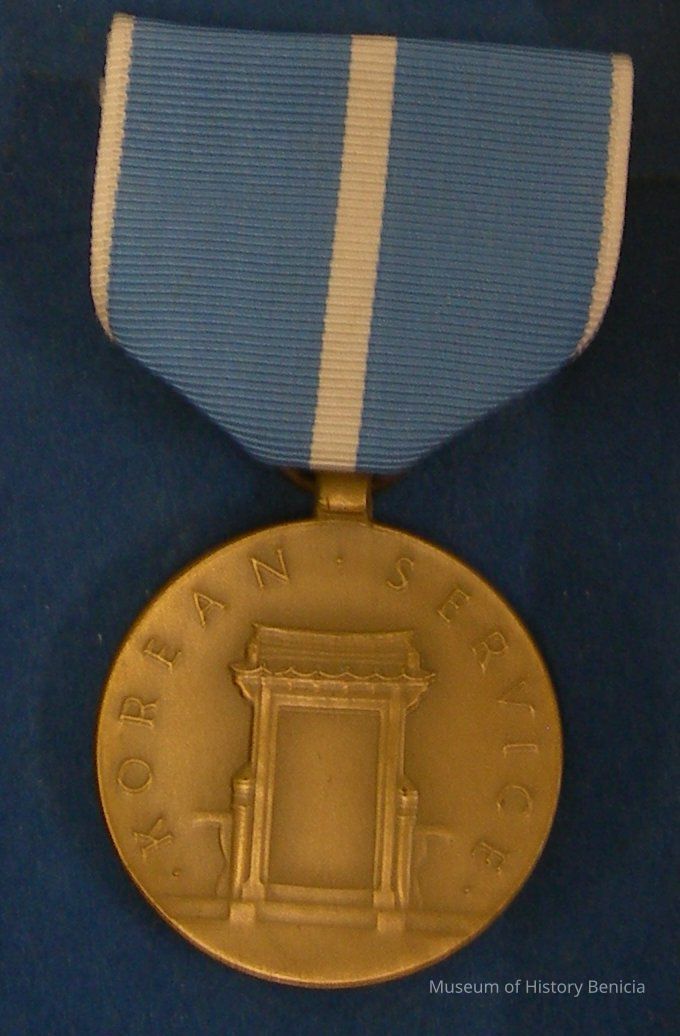 Korean Service Medal - pin-on blue ribbon with white stripe in center an on edge; on back: "United States of America"; 1-1/4" medal diameter, 1-1/4" x 1-1/2" ribbon;
