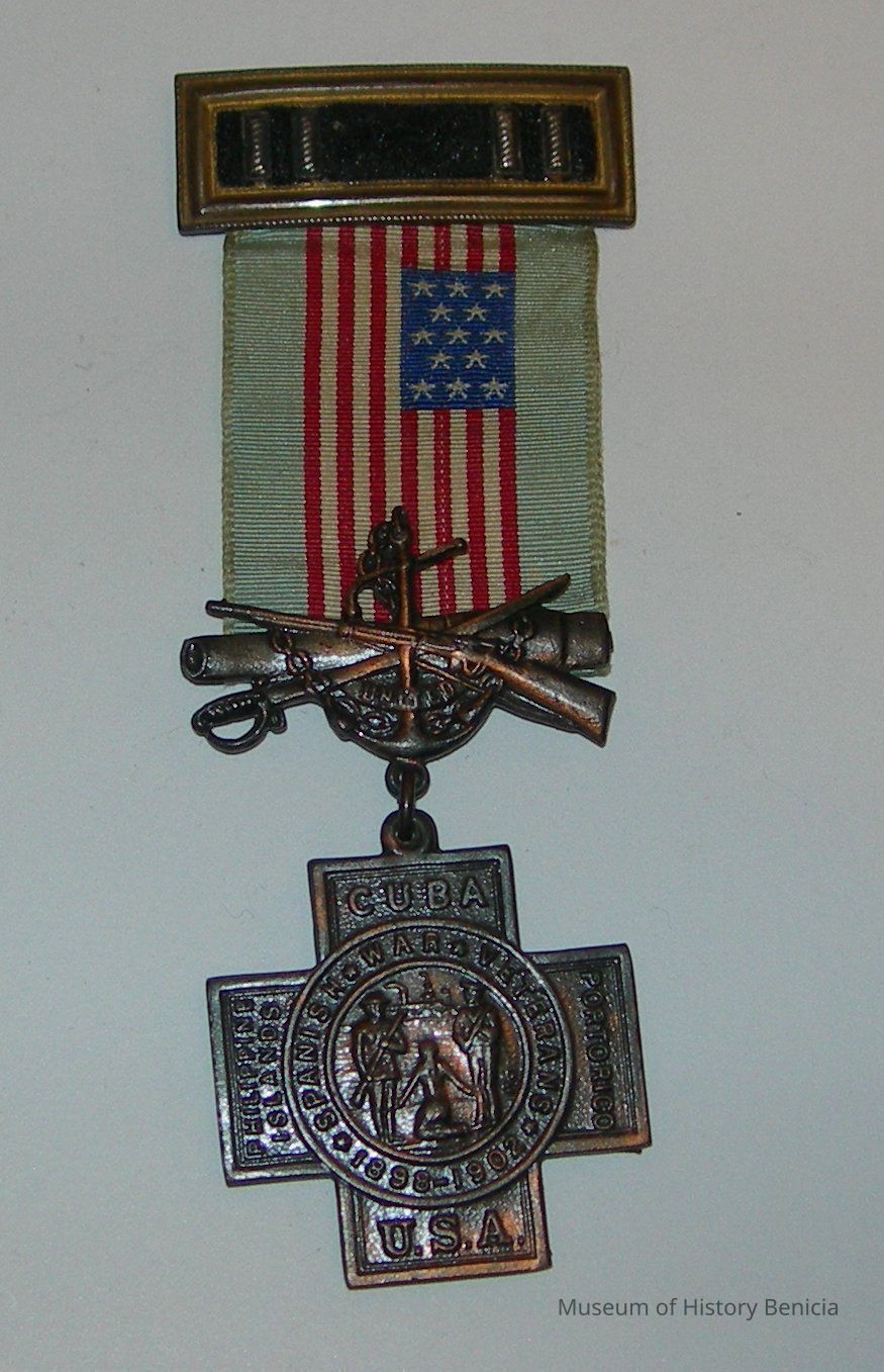 The medal is approximately 4" long and 1-1/2" wide. At the top can be an American eagle within a laurel weath and shield of victory or the rating of the recipient. The ribbon has 13 stripes and 13 stars. At the bottom of the ribbon is a cavalry saber, an infantry rifle, and a naval anchor all crossed, representing the various branches of the military. Dangling at the bottom of the medal is the Spanish American War cross, with the four arms reading "Porto Rico" (spelling at the time), "Cuba", "Philippine Islands" with "U.S.A." across the bottom. The dates on the cross read 1898-1902 with the words "Spanish War Veteran" around a scene of soldiers and a kneeling woman. The Spanish American War began and ended in 1898. The Philippine American War began in 1899 and continued into 1902, though some actions still occurred as late as 1906.