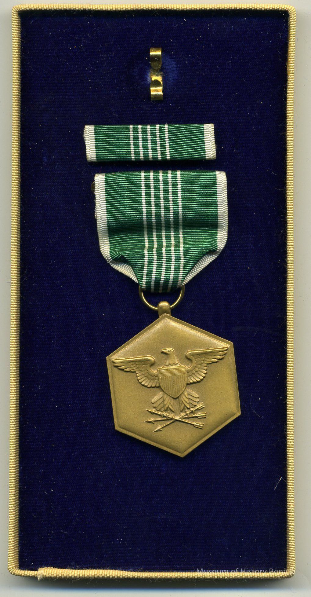 Military Medal - Milton Goldinger - Army Commendation Medal awarded by the Army for meritorious achievement of service - Bronze 'V' device worn to denote valor. Back states For Military Merit with no inscription. Medal accompanied with ribbon for same both on blue velvet in an appropriate box. This in turn was preserved in a plastic box. Undated and no markings.Collection
