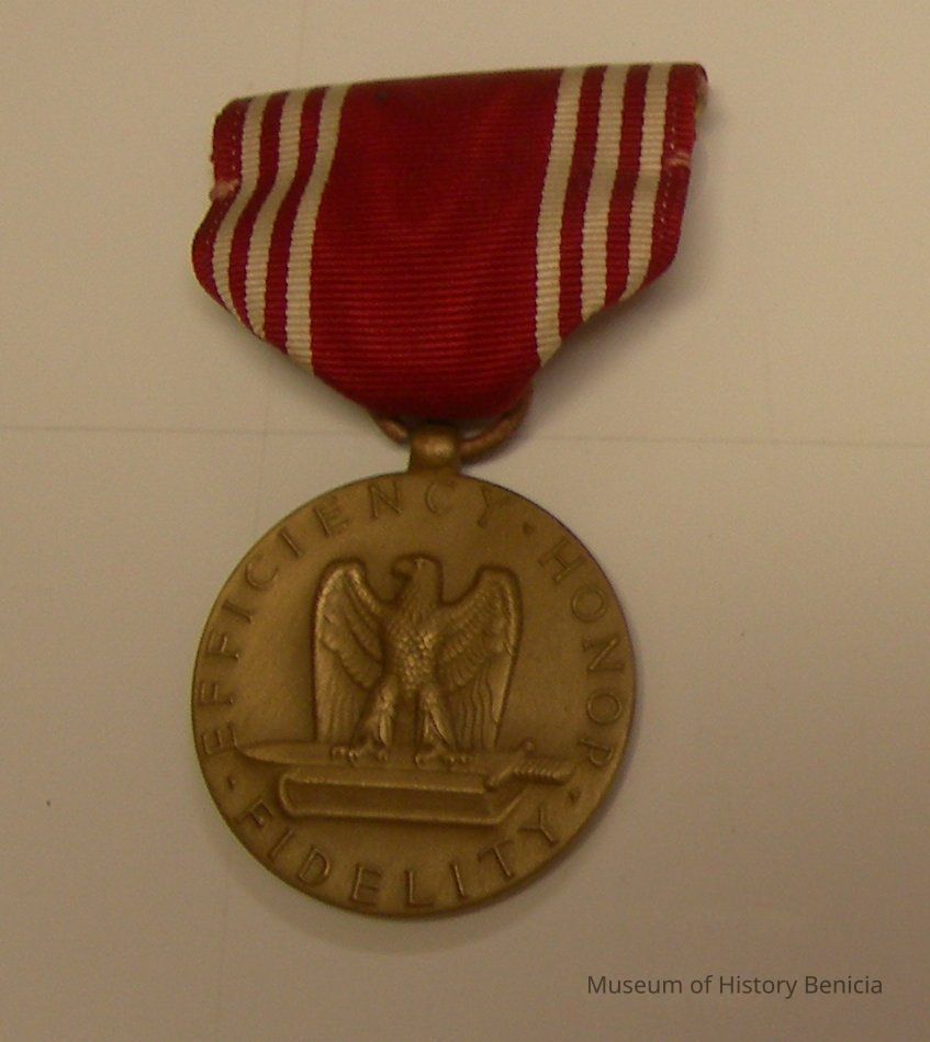 Red ribbon (1-1/2" x 1-1/4") with three white stripes on each side; medal is 1-1/4" diameter bronze on the front: spread-winged eagle and the words "Efficiency, Honor, Fidelity"; on the back: a wreath of leaves is around the edge "For Good" is above a five-oint star and "Conduct" is below.Collection