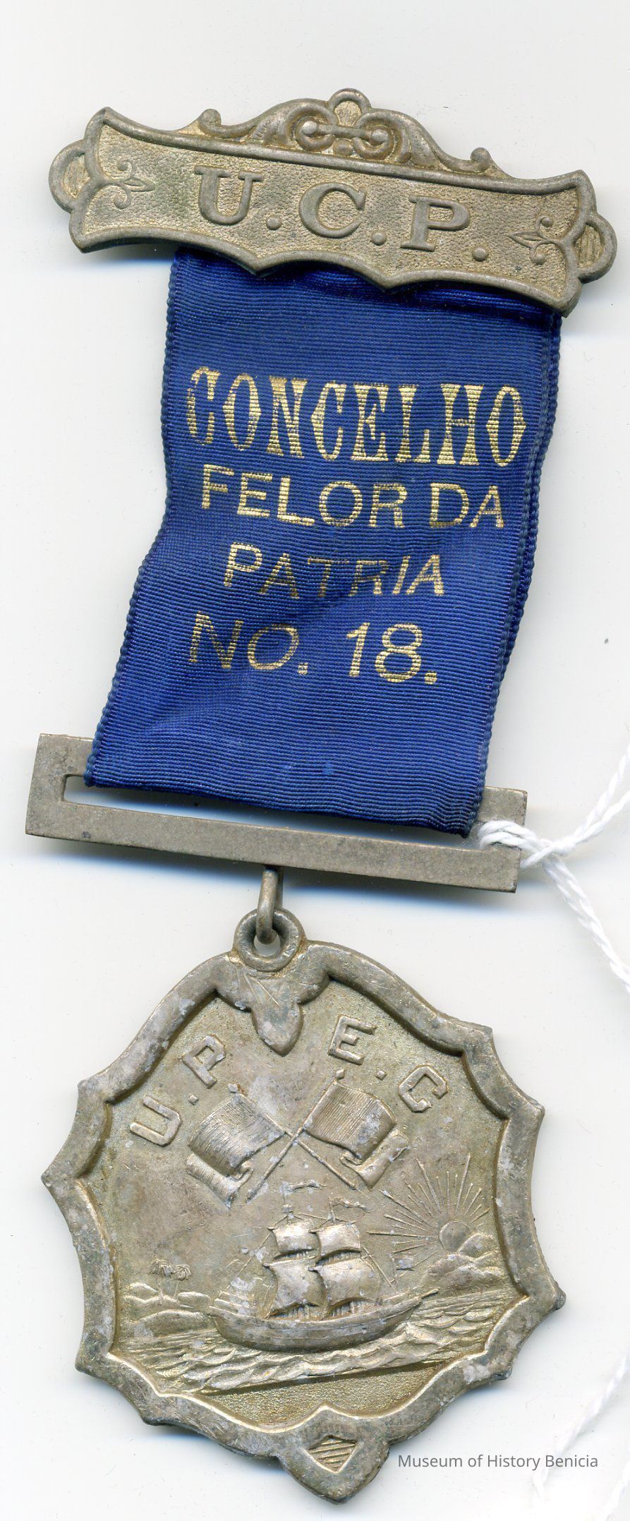 Medal - says "Conselho Flor da Patria" No. 18. Top bar says U.P.C. and medal says U.P.E.C. Unido Portuguesa do Estado California (United Portuguese of the United States)Collection