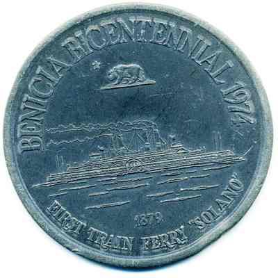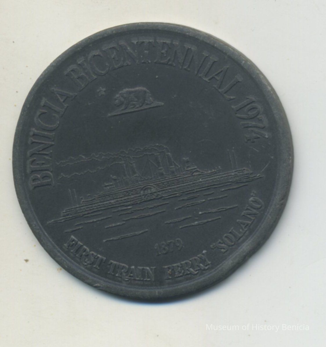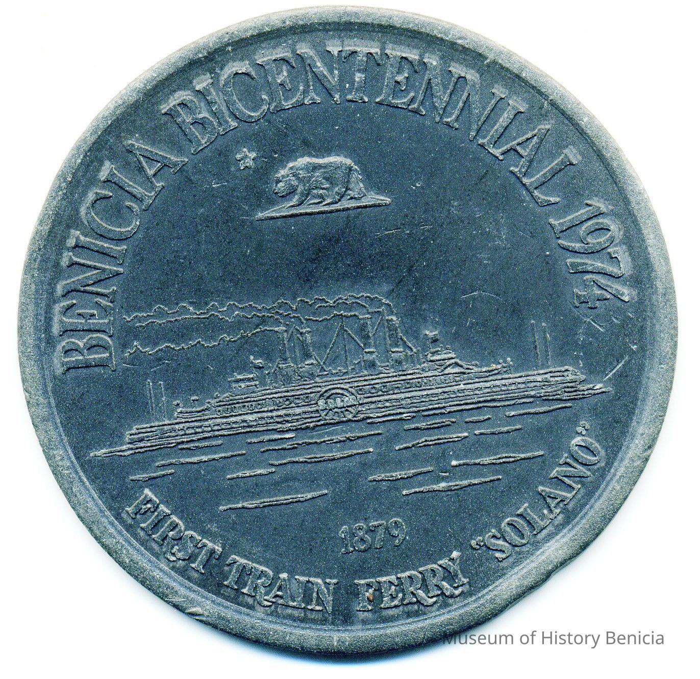 Round, flat disk stamped on one side only: "Benicia Bicentennial 1974, First Train Ferry 'Solano" 1879" with side view of ferry; a lead die slug;