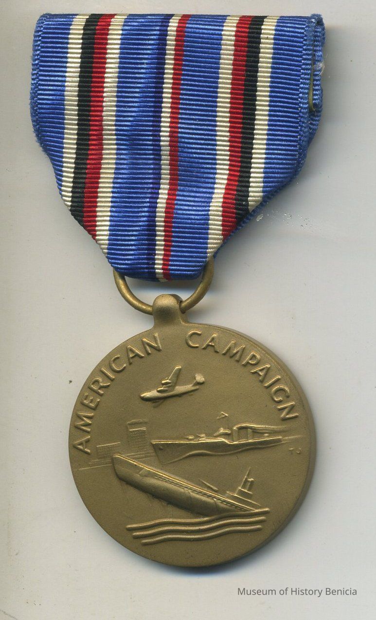 Medal - American Campaign WWII - ribbon: red, white, blue, black; medal: front "American Campaign" with representations of a plane, ships, and factories; back: standing eagle "United States of America 1941-1945"