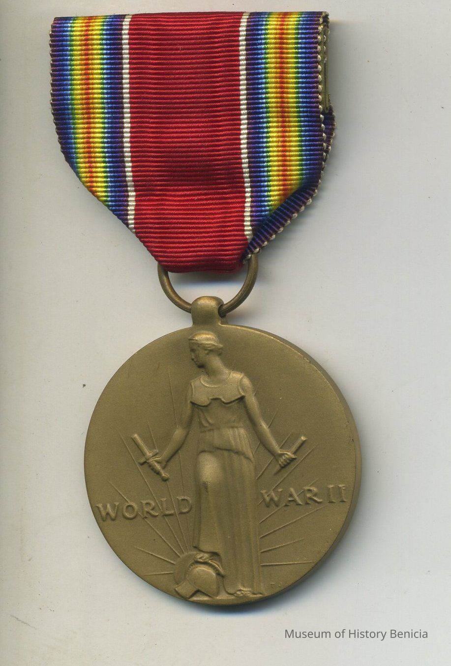 Medal - World War II Victory - rainbow colors with red center on ribbon; on medal front: in center if a female figure with one foot on a nazi helmet and "World War II"; on back: around edge: "United States of America 1941-1945" in center: "Freedom from Fear and Want Freedom of Speech and Religion"