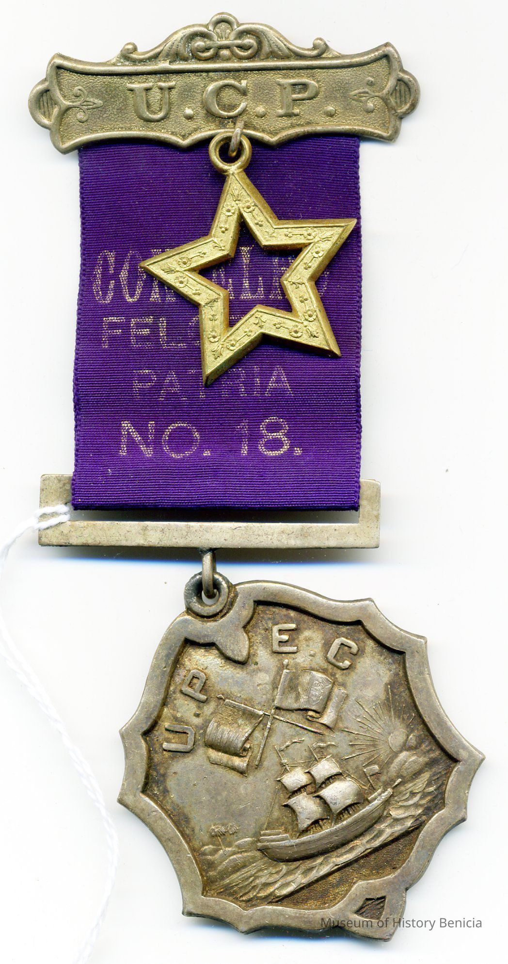Medal - says "Conselho Flor da Patria" No. 18. Top bar says U.P.C. and medal says U.P.E.C. Unido Portuguesa do Estado California (United Portuguese of the United States). There is also a metal star hanging from the top bar.Collection