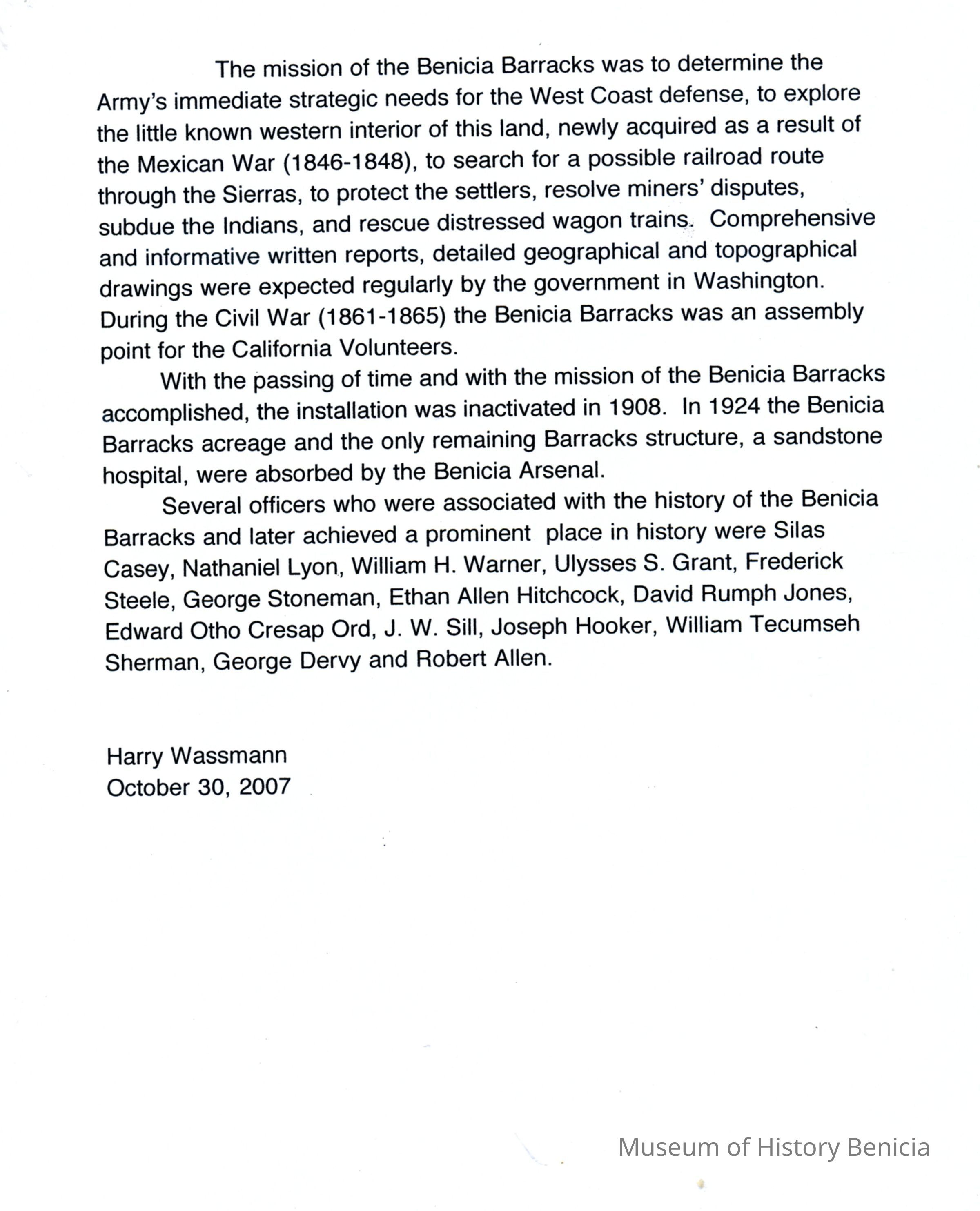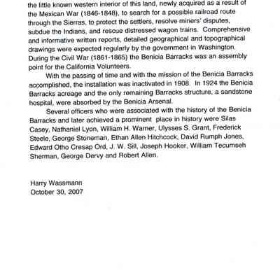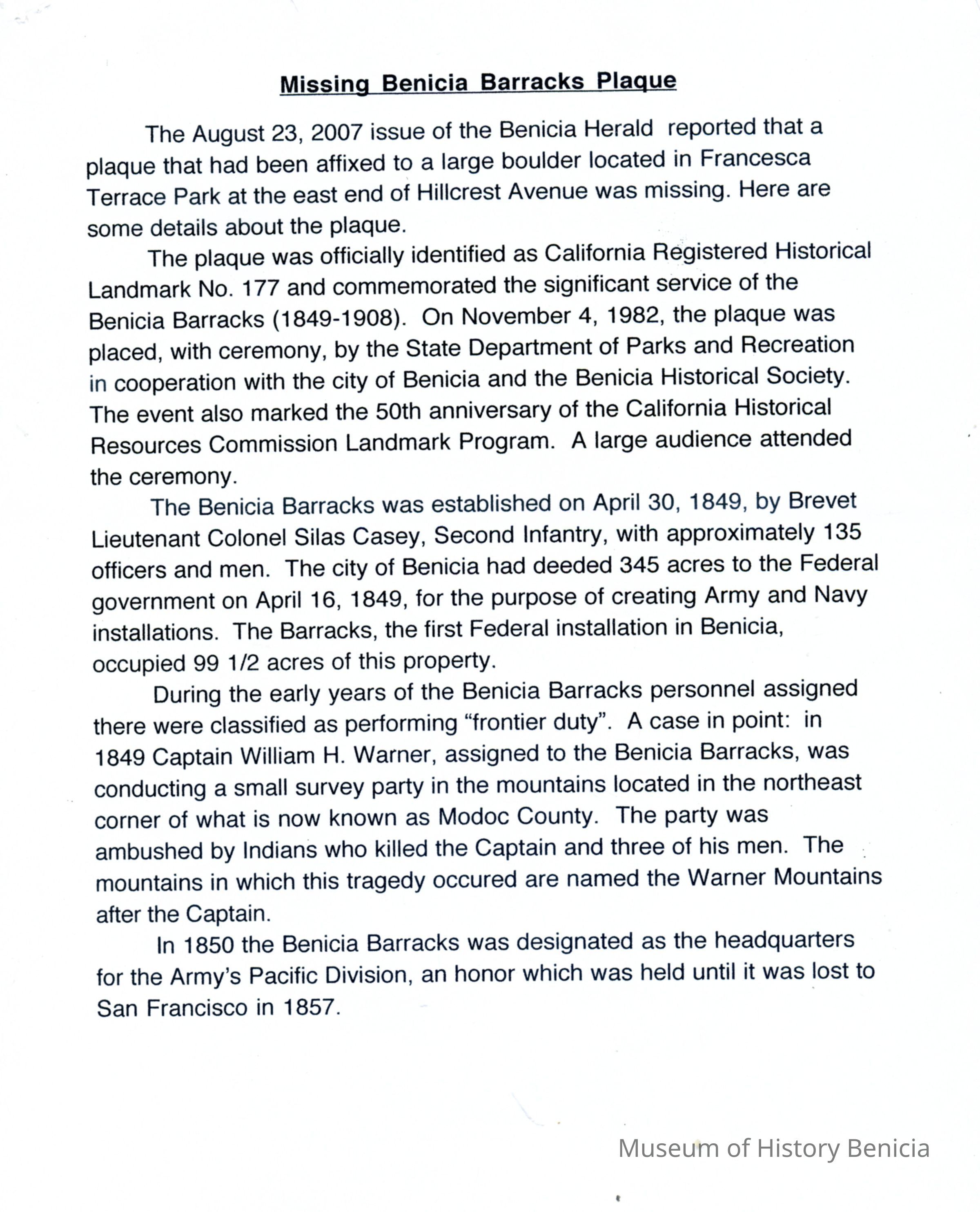This is a write-up on the Benicia Barracks by Harry Wassmann in 10/03/2007. It talks about the disappearance of the Benicia Barracks plaque missing. This was the memorial placed there in 1982. He then recaps the history of the barracks from its start in 1849 by Lt. Colonel Silas Casey to its inactivation in 1908.Collection