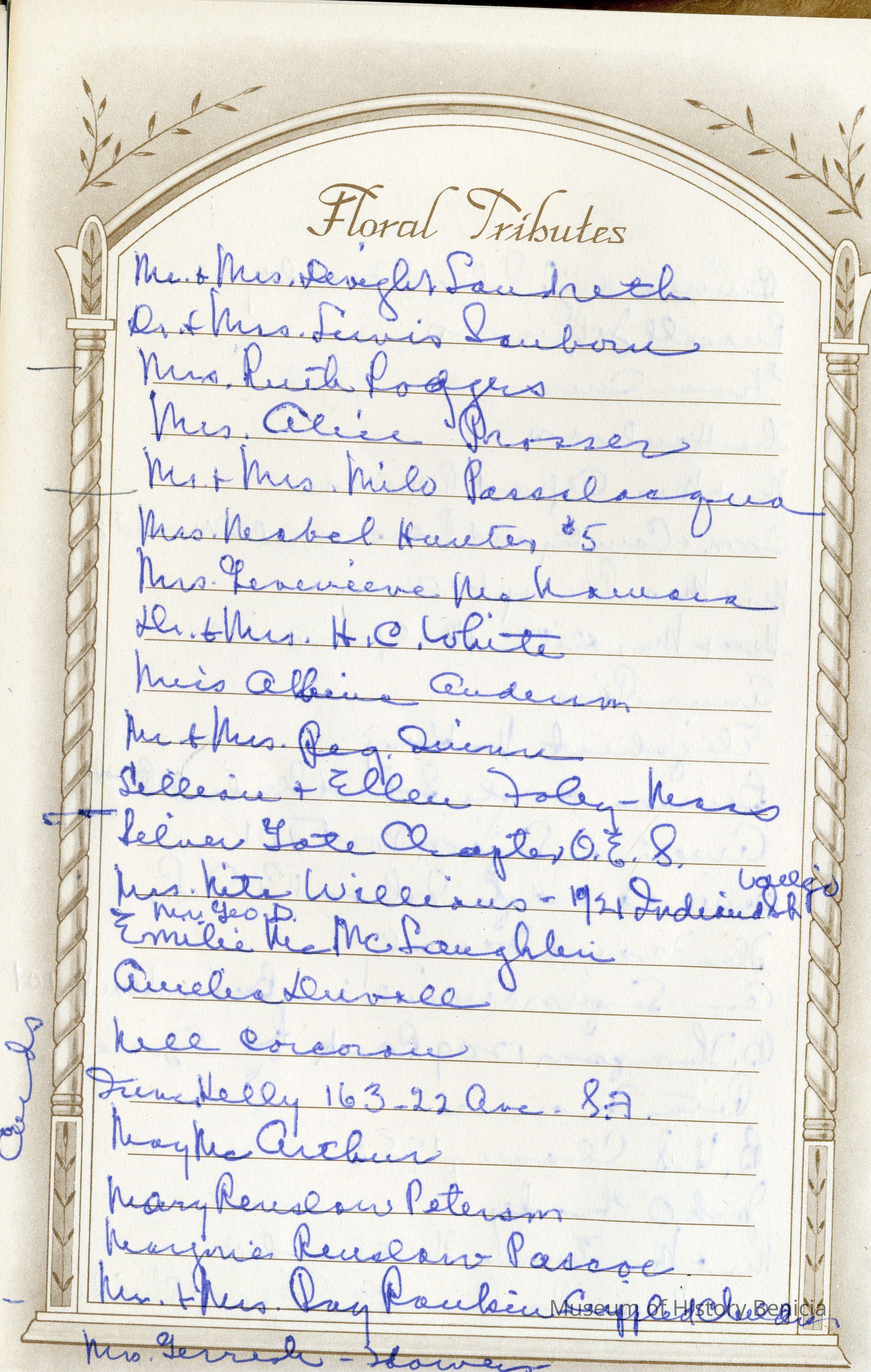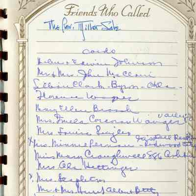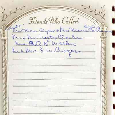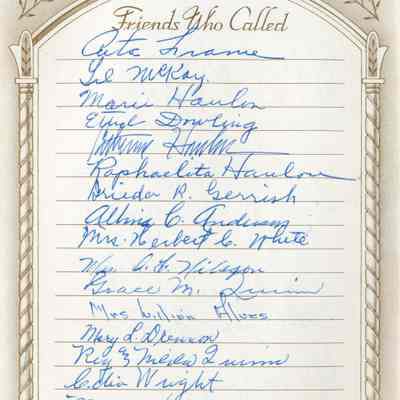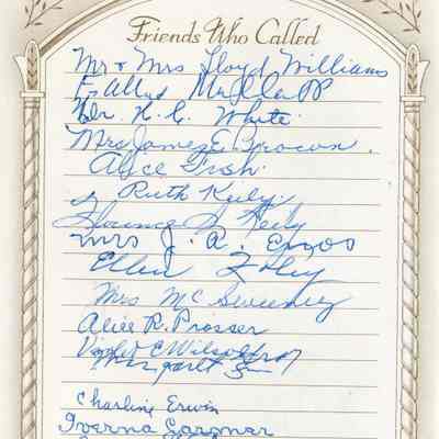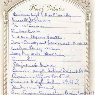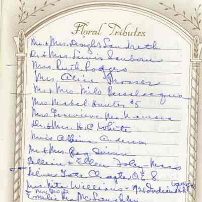 This is a Memorial book for the funeral of Fannie Buckley Crooks (Mayor Crooks wife). She was born 02/02/1859 and died 09/09/1951. The book lists many friends who attended the funeral and many more who left floral tributes.Collection
