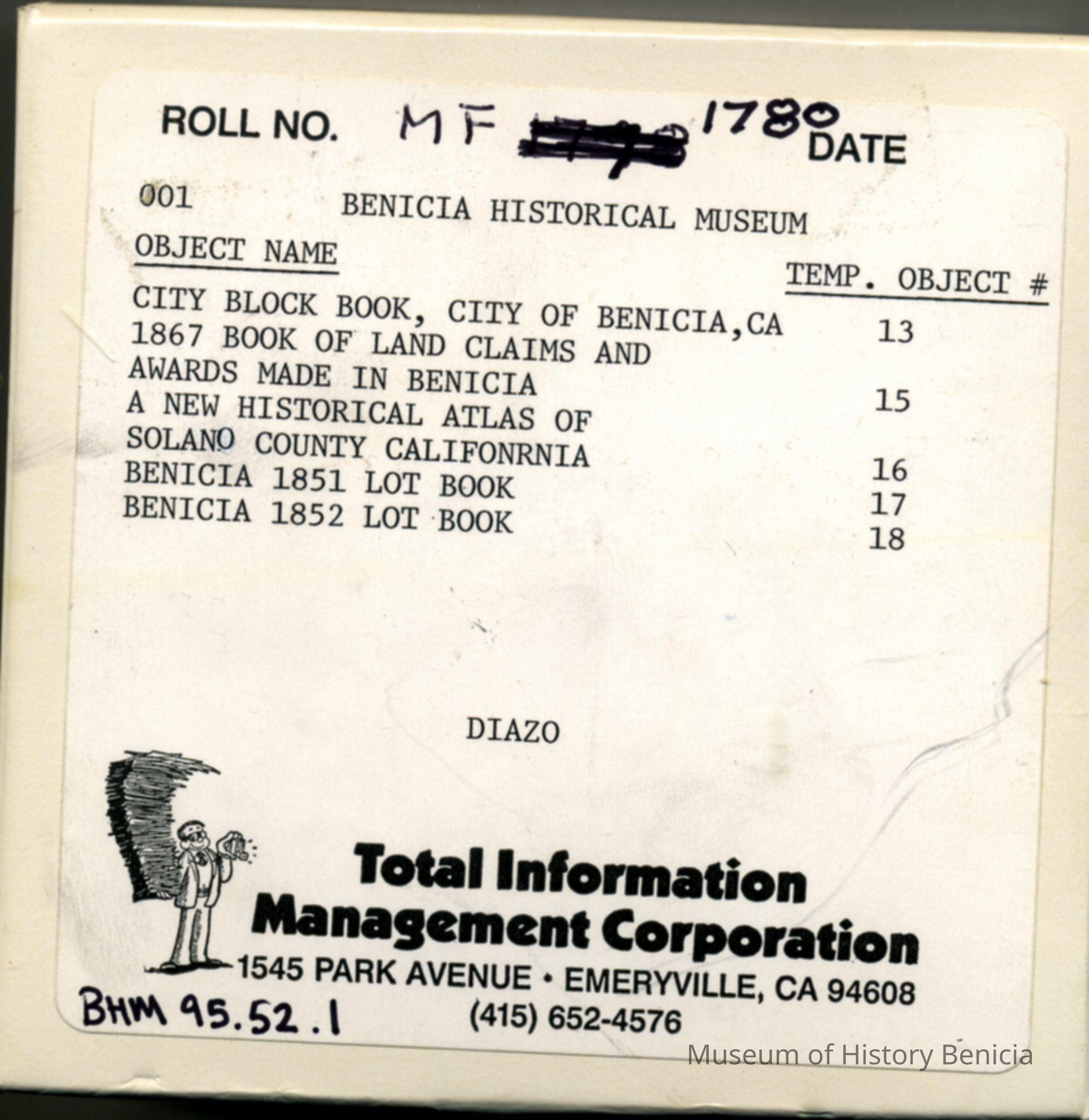 Microfilm of: City block book, 1867; Book of land claims; A New Historical Atlas of Solano County; Benicia 1851 Lot Book; Benicia 1852 Lot Book.Collection