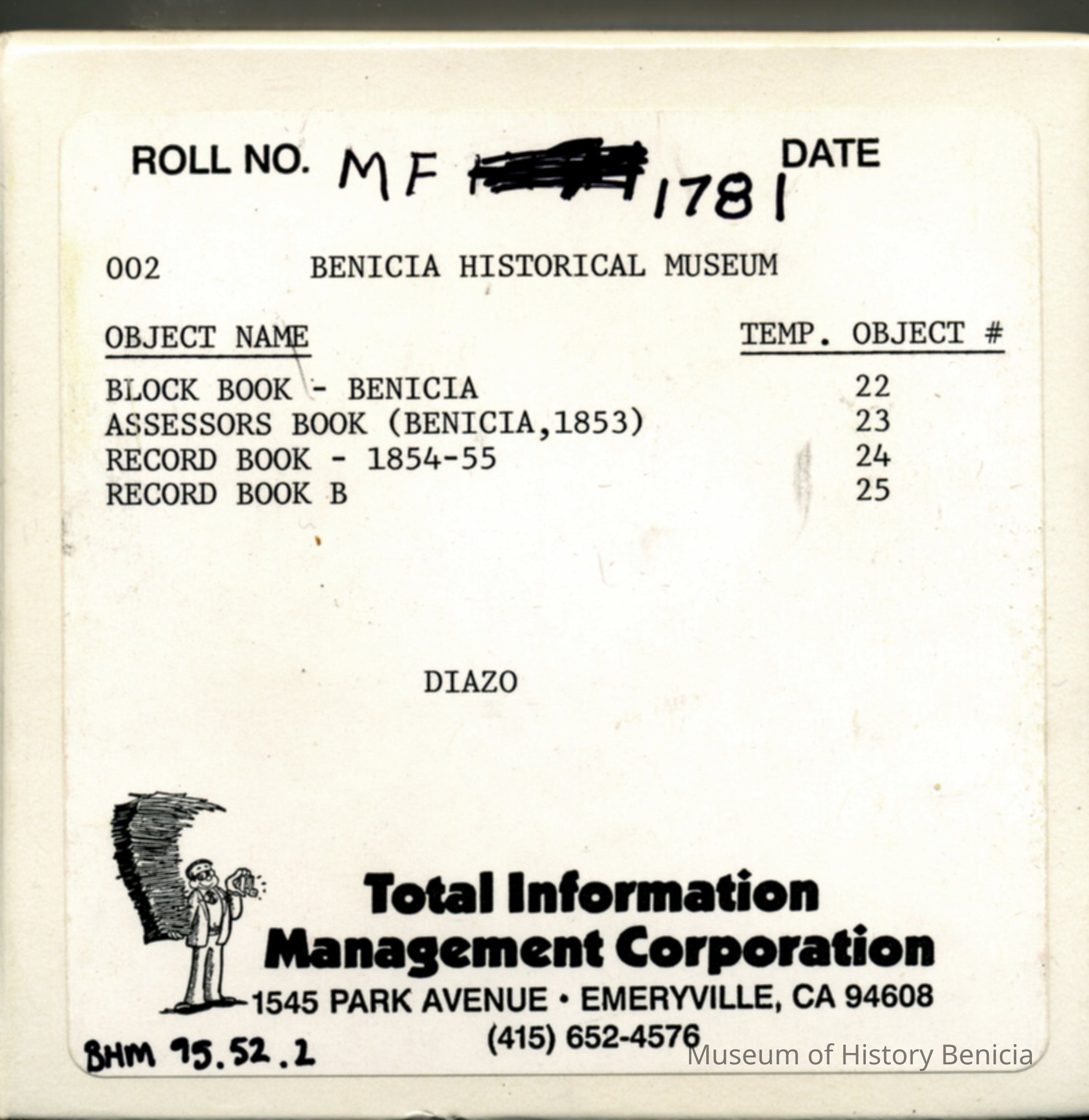 Microfilm of: Block Book, Benicia; Assessors Book, Benicia, 1853; Record Book, 1854-55; Record Book B.Collection