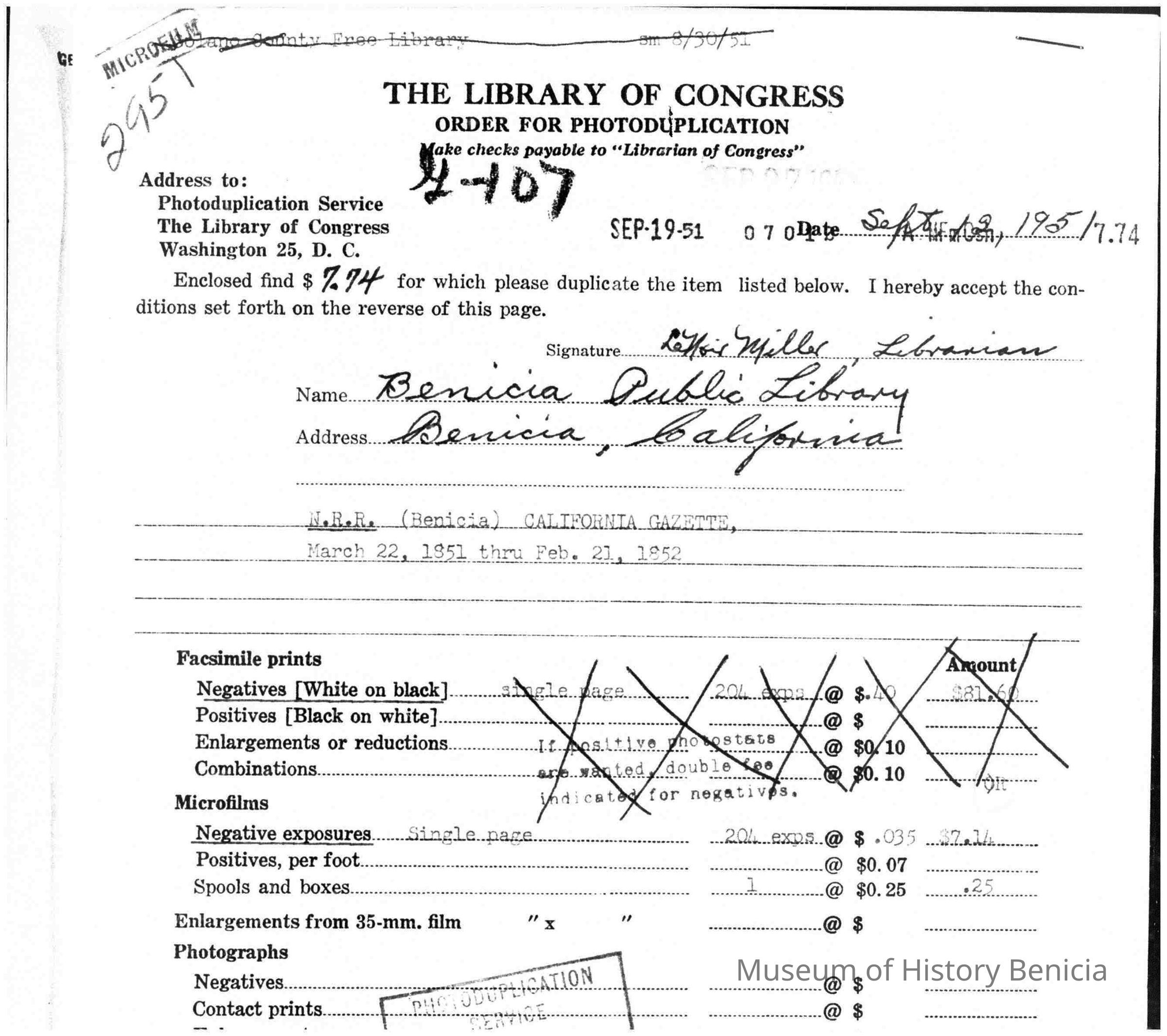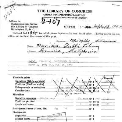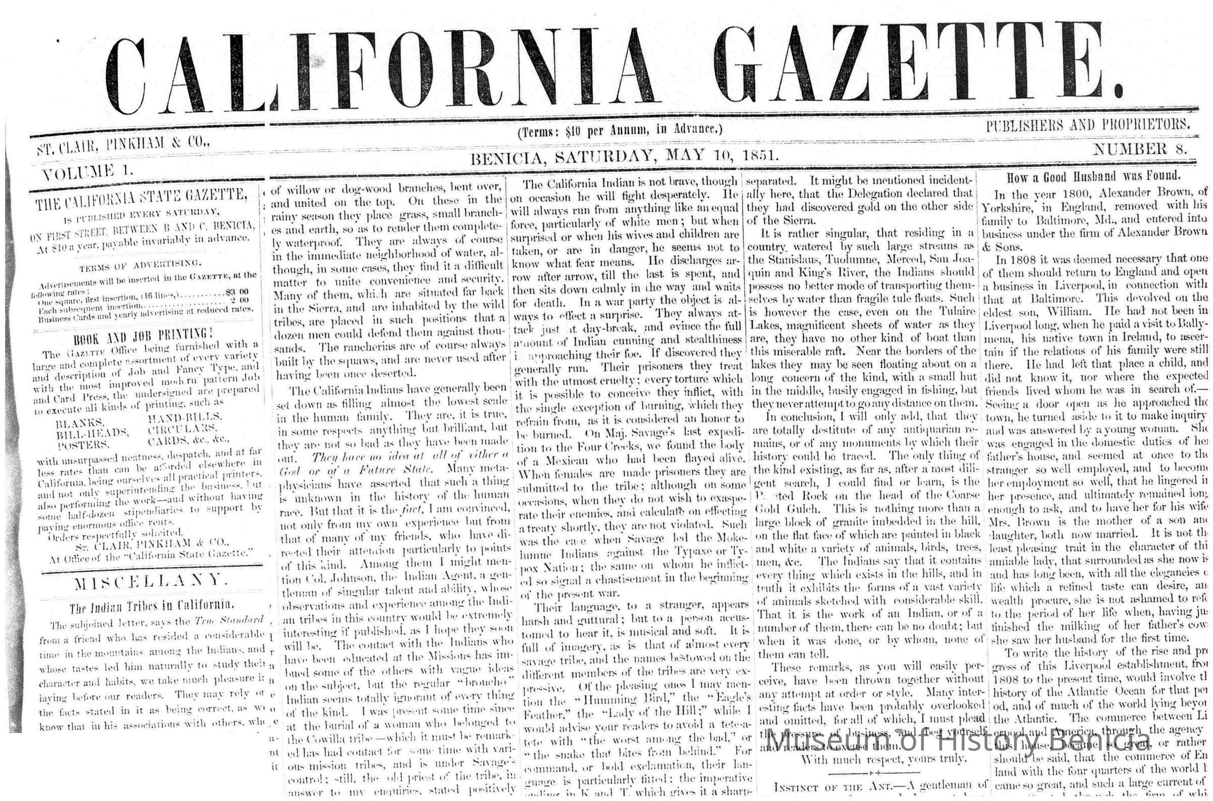 Microfilm of the early Benicia newspaper "California Gazette". Dates: March 22, 1851 to February 21, 1852.