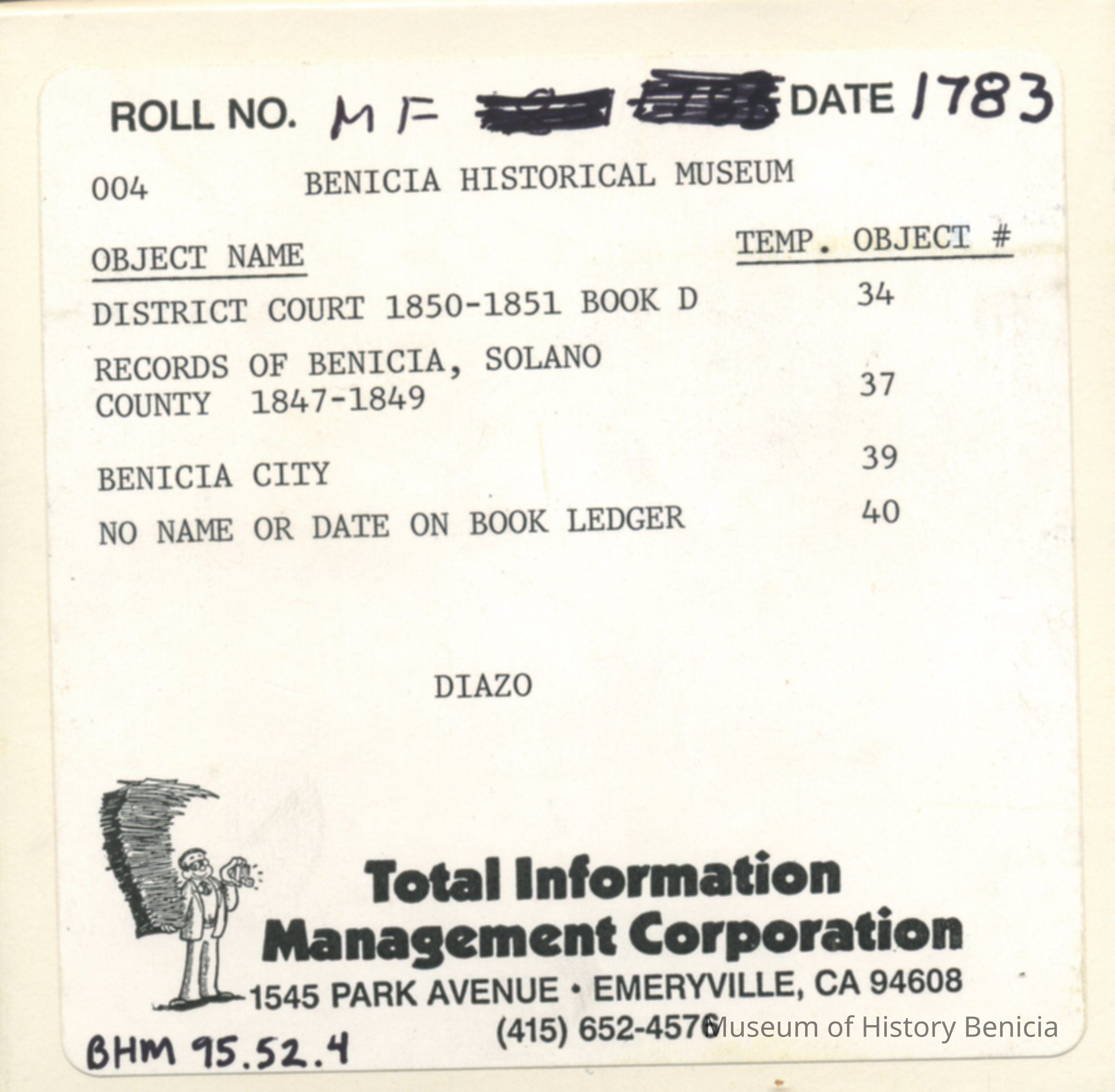 Microfilm of: District Court 1850-51 Book D; Records of Benicia Co. 1847-49; Benicia City. No name on back ledger.Collection
