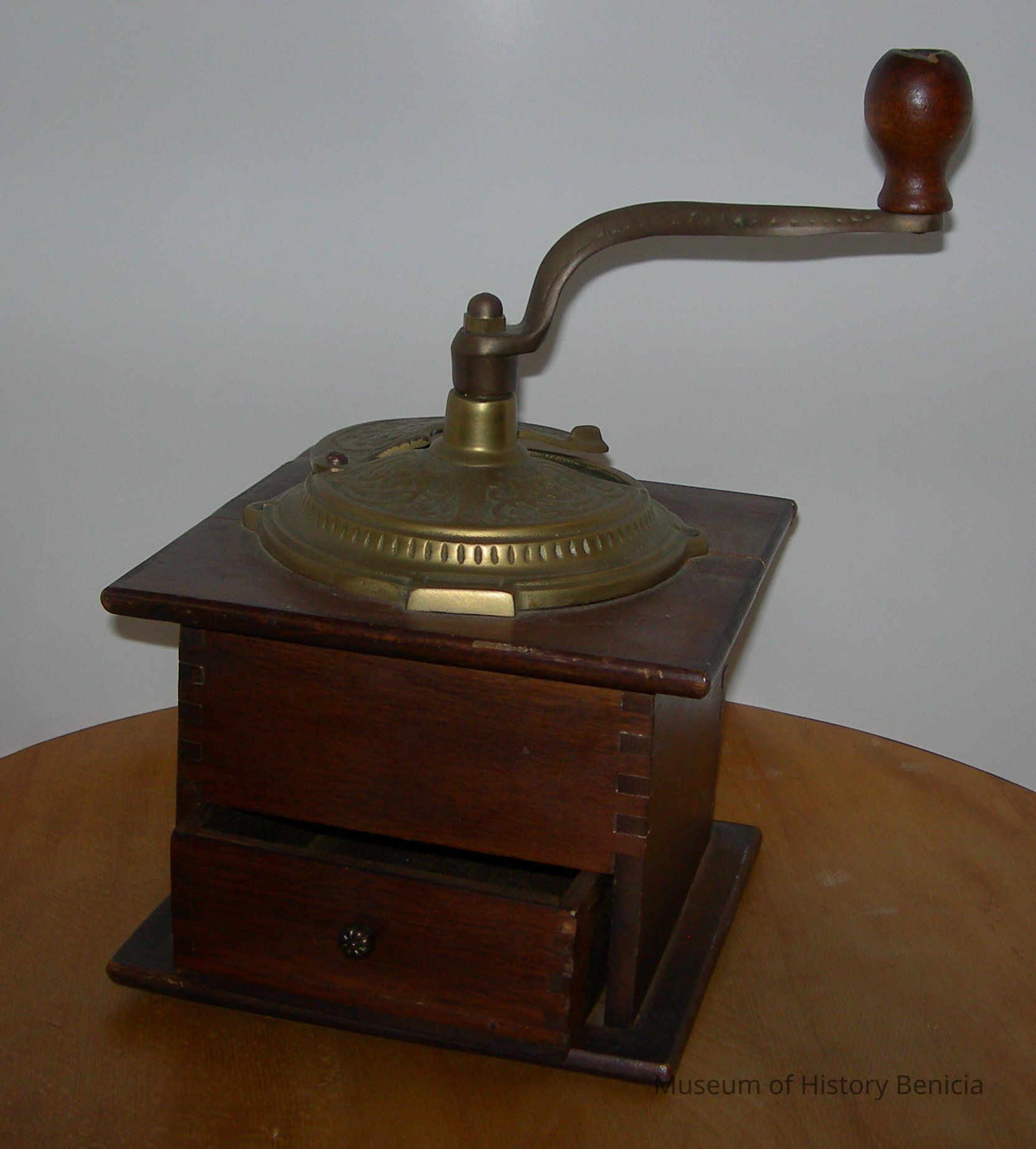 Brown wooden coffee mill/grinder, decorative metal lid which separates to allow for entry of coffee beans, metal handle with wooden know, small drawer (4-3/4" x 5-1/4") at bottom to catch grounds and remove from grinder.